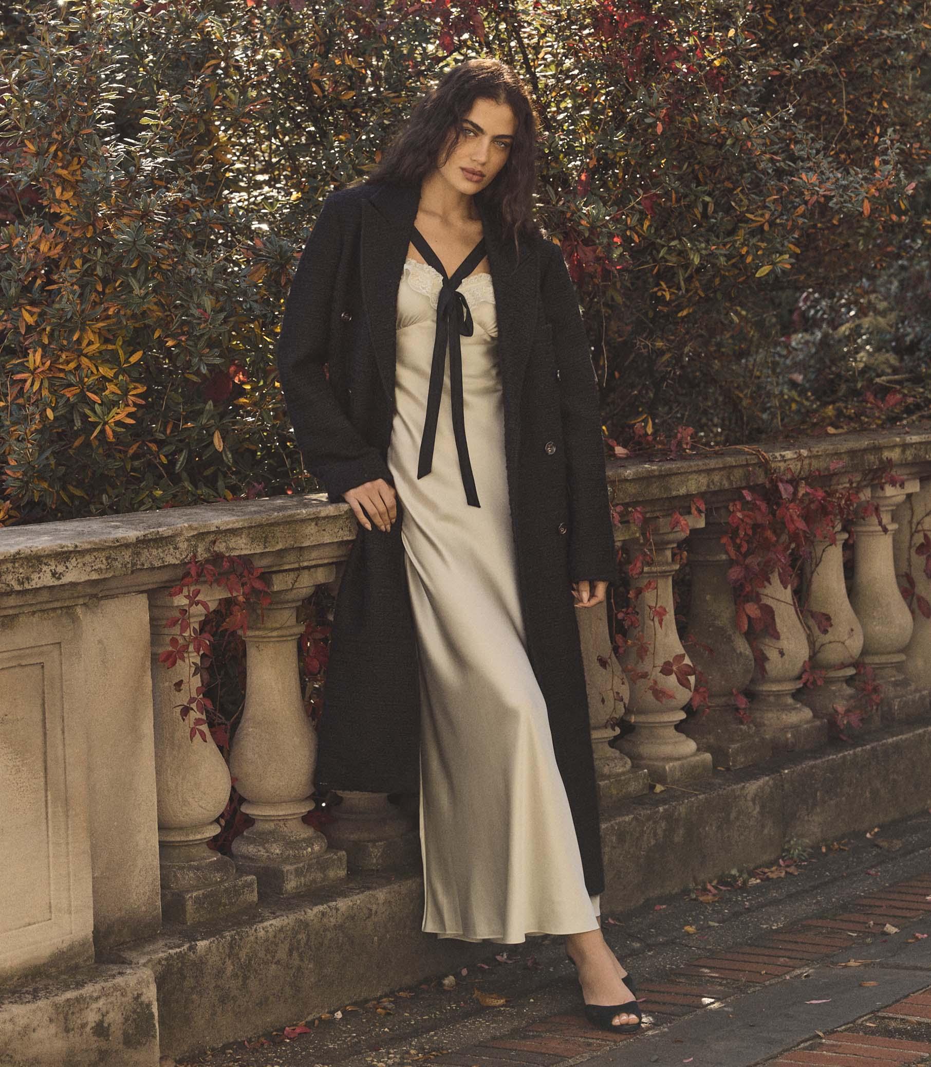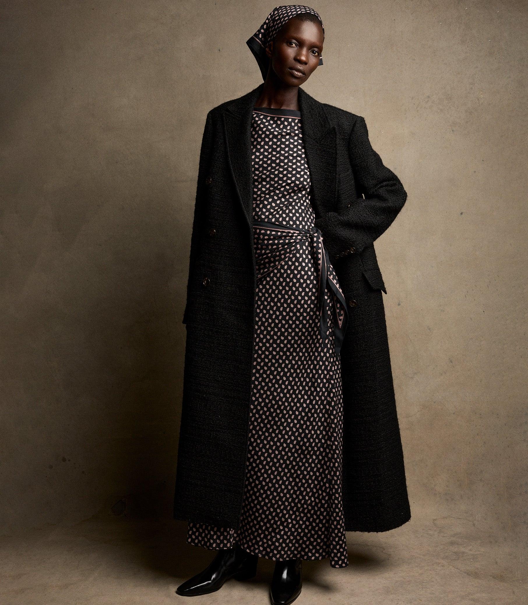 Inspired by the sharp suiting styles of the ‘70s and rendered in a bouclé tweed, the fully lined DÔEN Heirloom Wilhelmina Coat features an exaggerated collar with a notched lapel, full-length sleeves, and a tailored silhouette. Four buttons extend down the front, and two front welt pockets (plus three interior pockets) make the perfect place to tuck cold hands.
