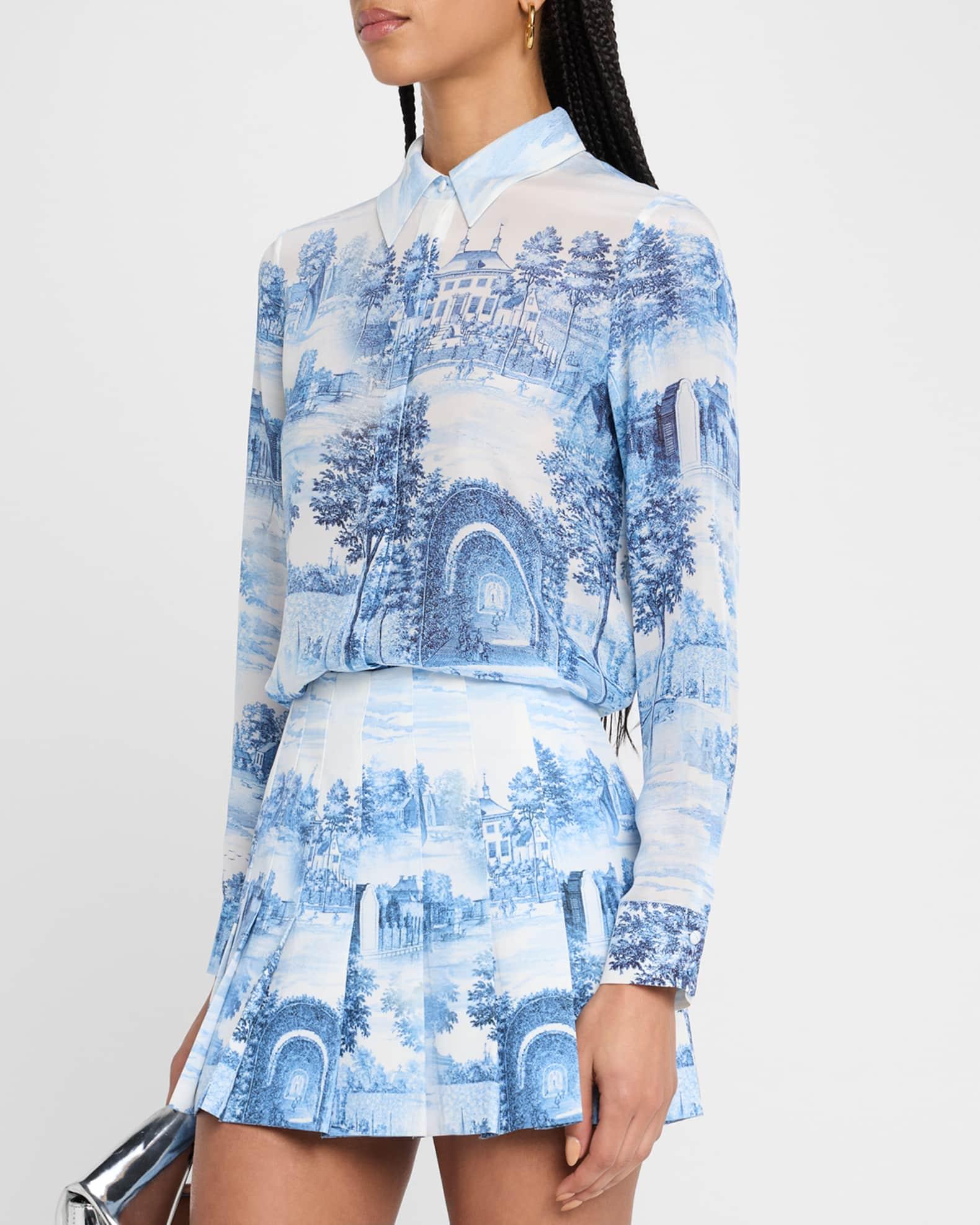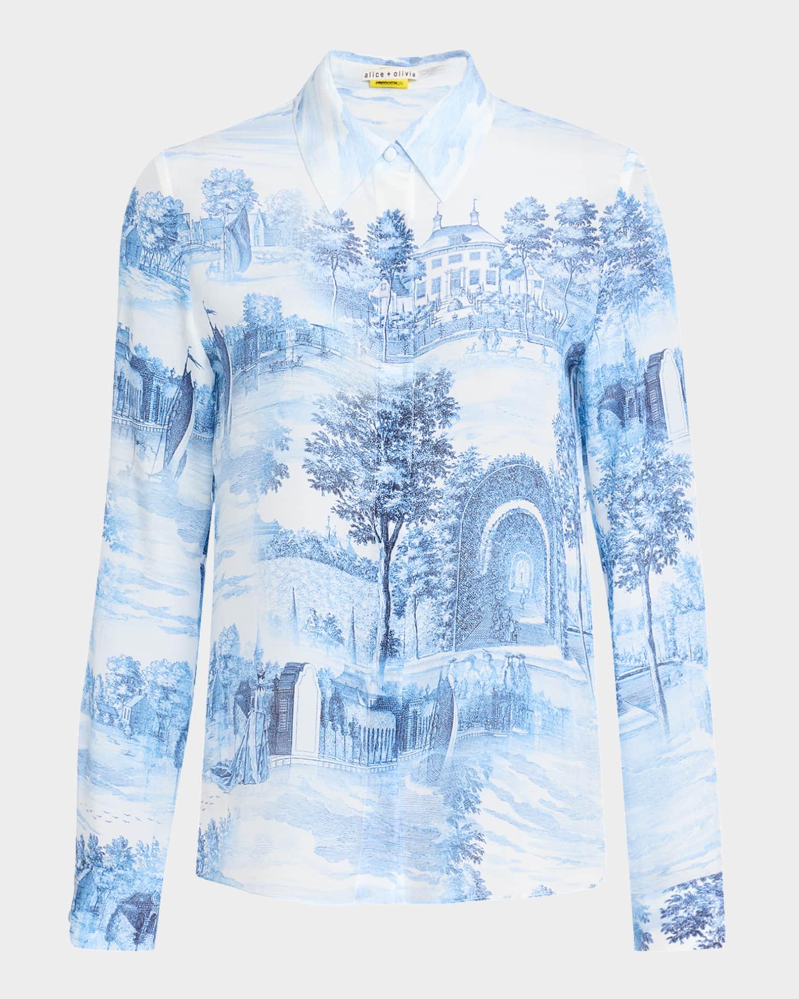 Alice + Olivia "Willa" sheer silk top boasts a Chateau motif Point collar Long sleeves with button cuffs; approx. 21.3"L Relaxed fit Hem falls to the hip Hidden placket Silk Unlined Dry clean Imported