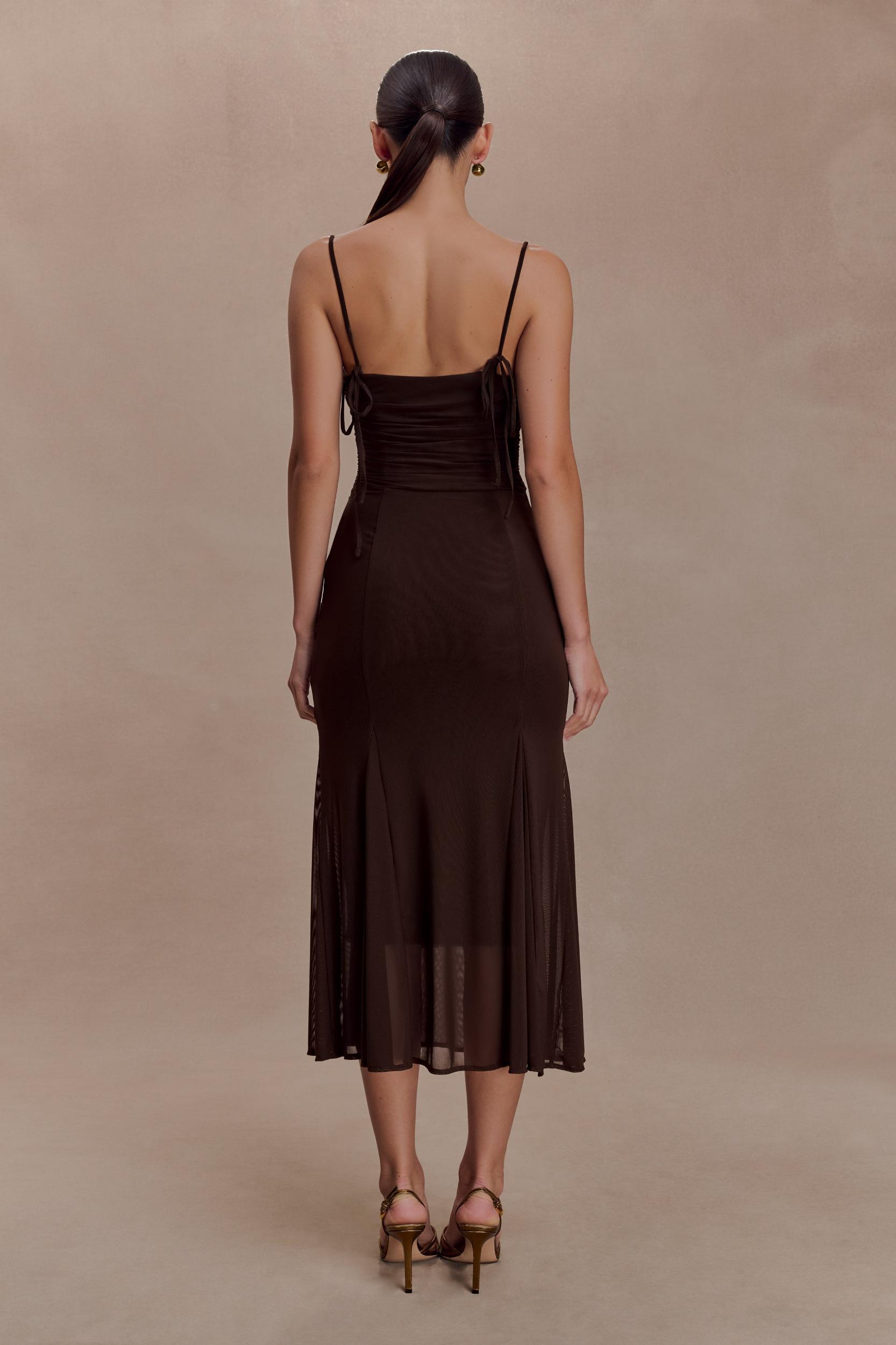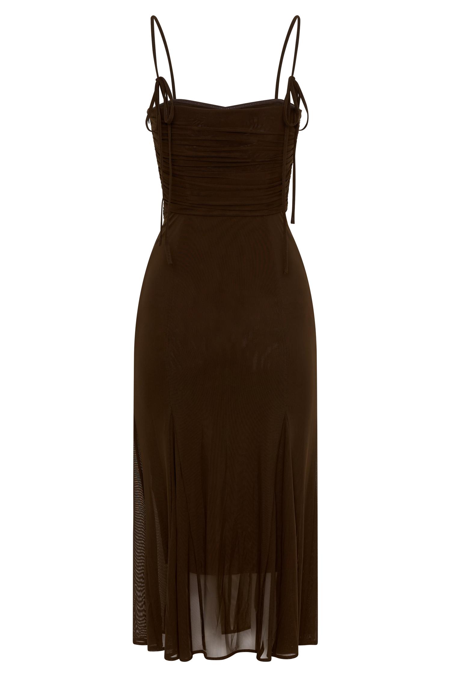 Soft mesh, sculpted romance. The WILLA Gathered Mesh Midi Dress is designed to contour with delicate precision. Featuring a sweetheart neckline, it frames the décolletage with a romantic touch, while gathered detailing through the bodice enhances shape and texture. Adjustable back shoulder ties allow for a personalised fit, complemented by a clean back zip closure. Partially lined for comfort and coverage, this midi-length silhouette balances sheer softness with a fitted finish — elegant, modern, and effortlessly refined.