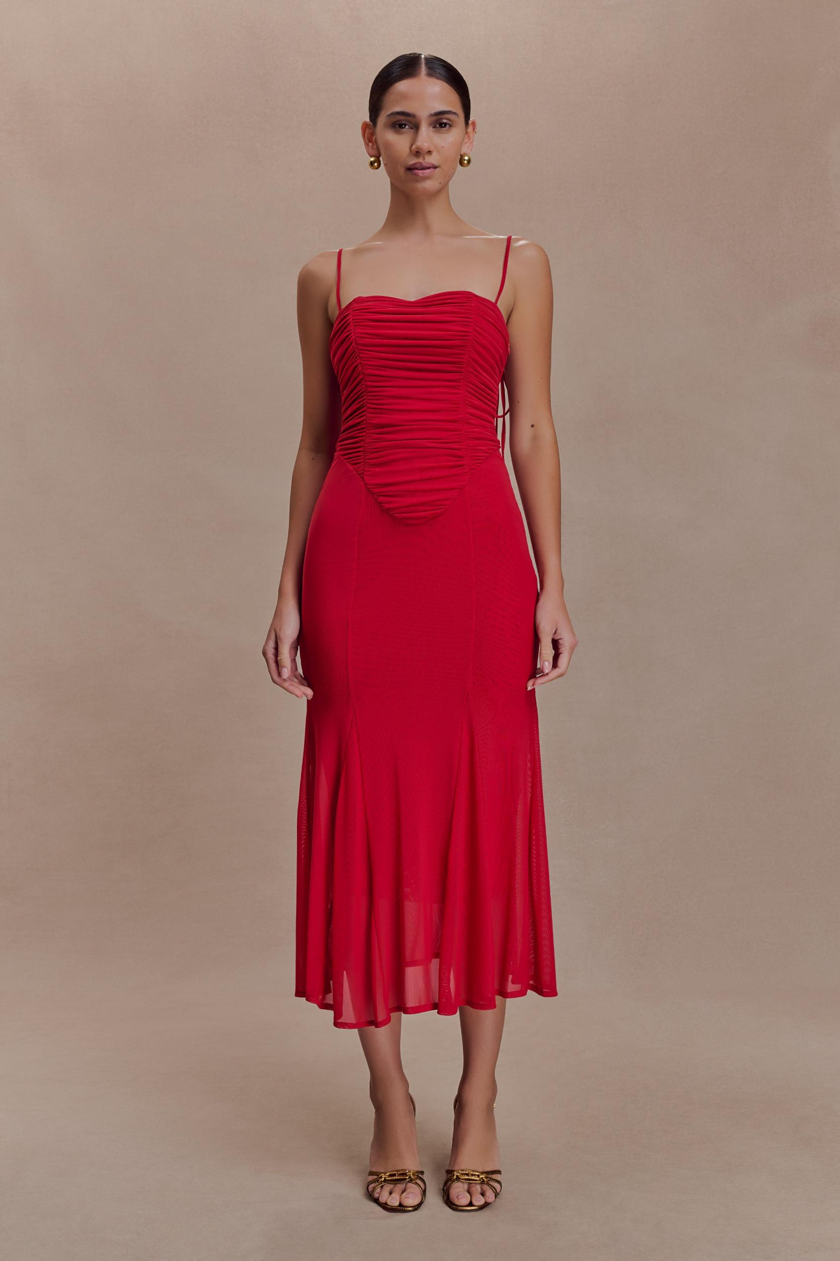 Willa Gathered Mesh Midi Dress - Ruby