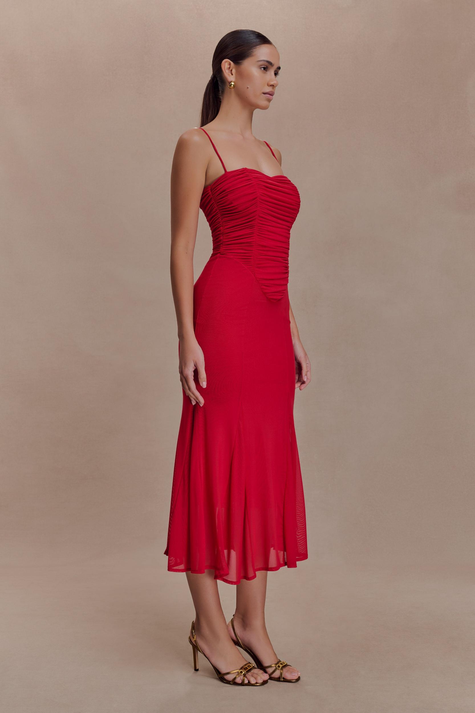 Willa Gathered Mesh Midi Dress - Ruby Product Image