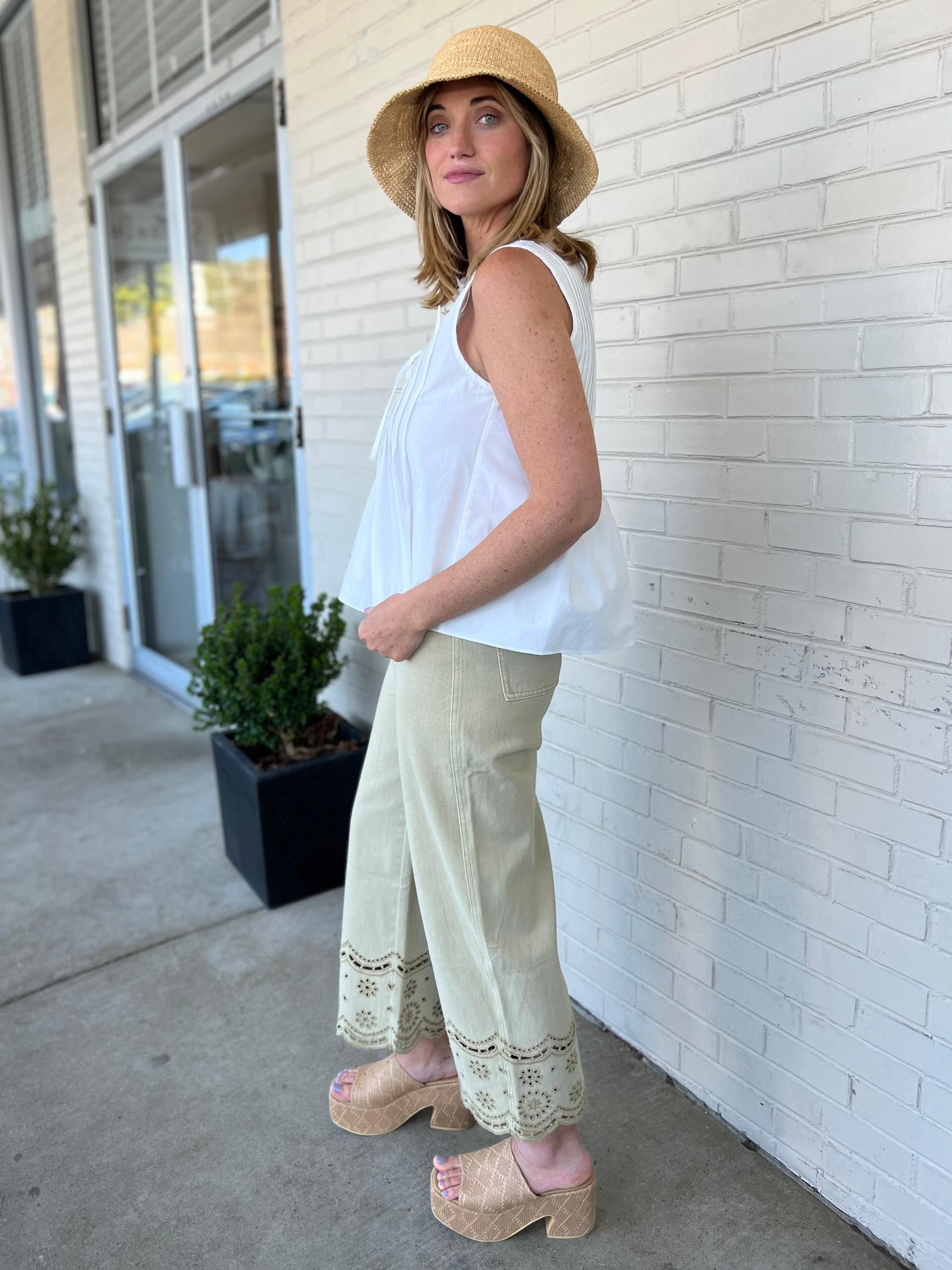 Get ready to elevate your fashion game with our Willow Pants. These washed olive denim pants feature a high waist for a flattering fit and a wide leg design that adds a touch of retro charm. As an extra surprise, eyelet detail at the bottom will give your outfit a unique edge. A stylish and playful addition to your wardrobe. Pants have never been this fun!