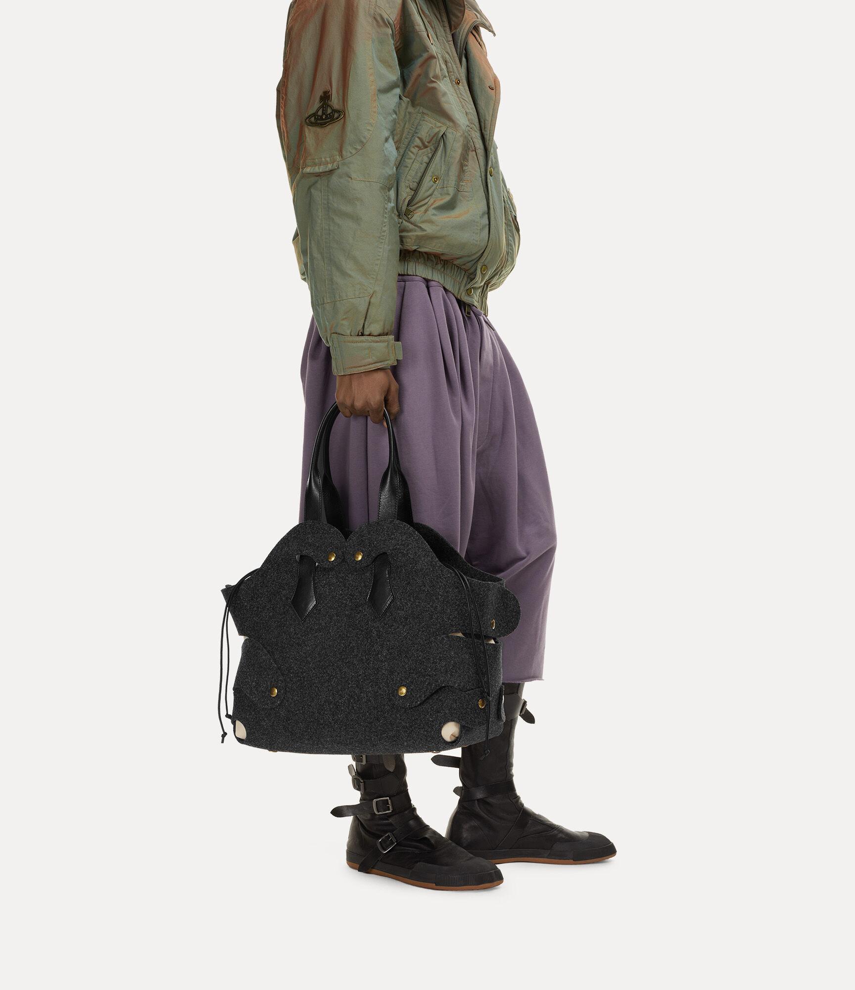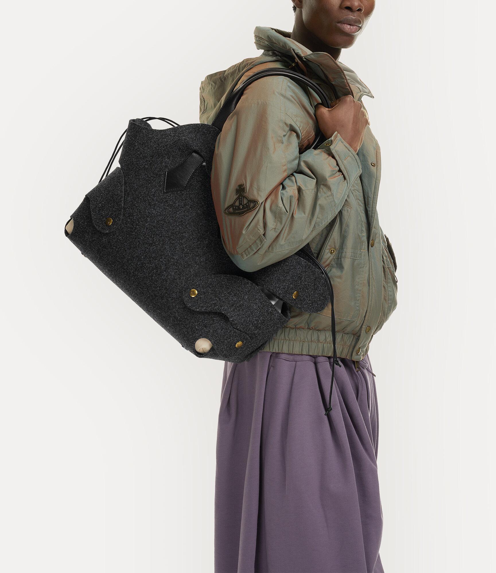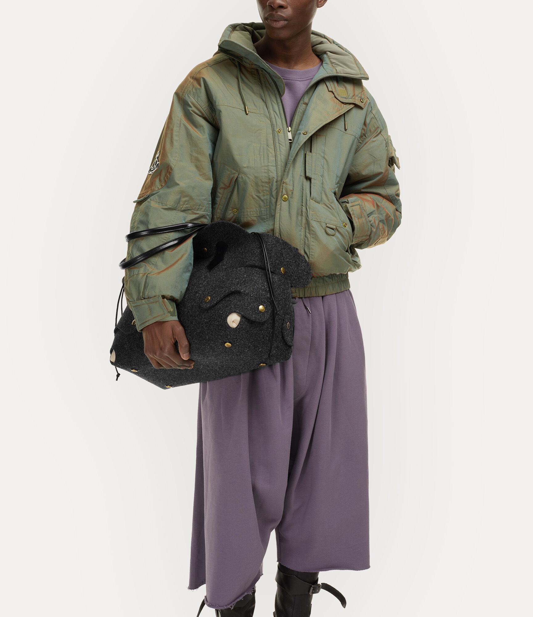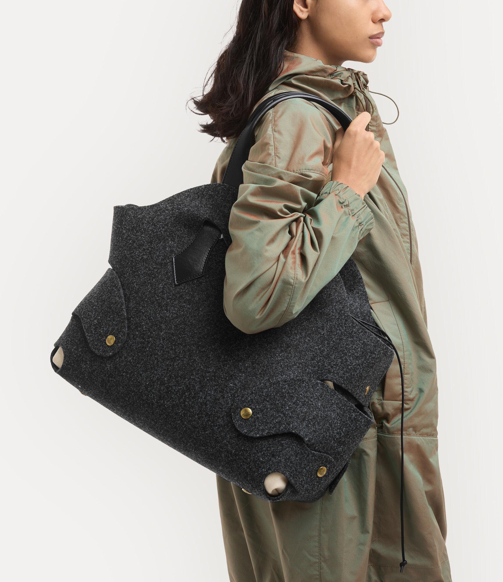The Wilma Large tote is crafted from thick wool felt using a no-waste cutting technique first developed for the Autumn-Winter 2007 ‘Wake Up Cavegirl’ collection. Inspired by our archival Flintstone bags, the piece features a modular popper system and signature spearhead handles threaded through the outer shell.