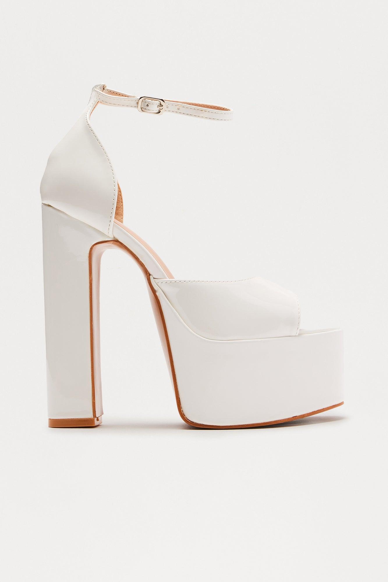 Available In Black And White. Platform Heeled Sandals Peep Toe 4" Ultra High Block Heel Imported California Proposition 65WARNING: Cancer and Reproductive Harm - www.P65Warnings.ca.gov.