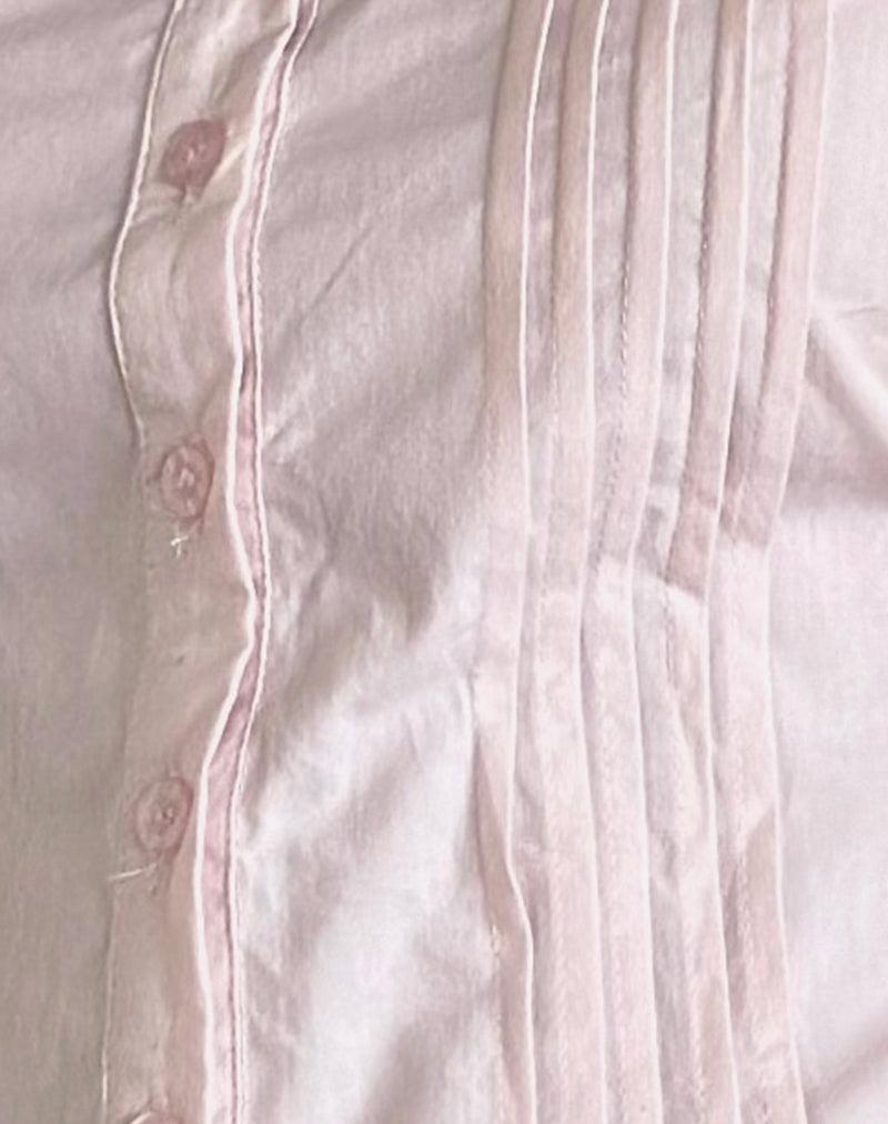 In a light pink poplin, the Wilmot blouse features a full length, flared hem with short sleeves, a button up front and a collared neckline. Complete with shirred detailing down the centre front. Paired with our Ritala shorts. MODEL WEARS SIZE:EXTRA SMALL - MODEL HEIGHT:5'7