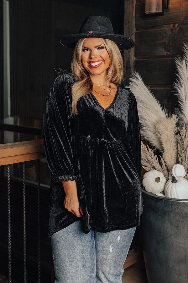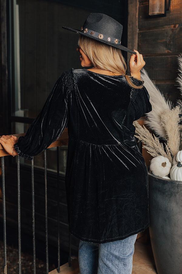 - This luxe piece has a rich texture and trendy style! - Unlined velvet material - A v-cut neckline - Smocked shoulder detail - Long, loose sleeves with elastic ruffle cuffs - A flowy yet flattering silhouette that ends in straight hemline