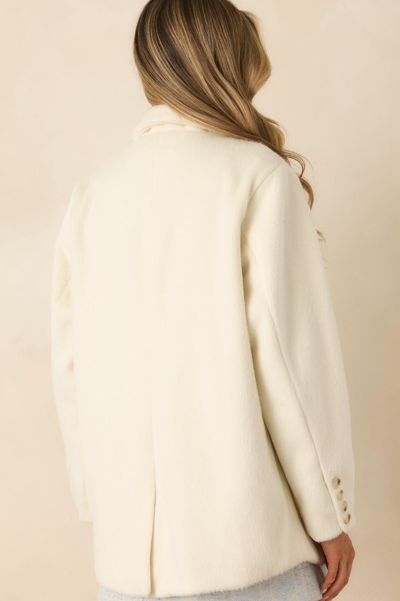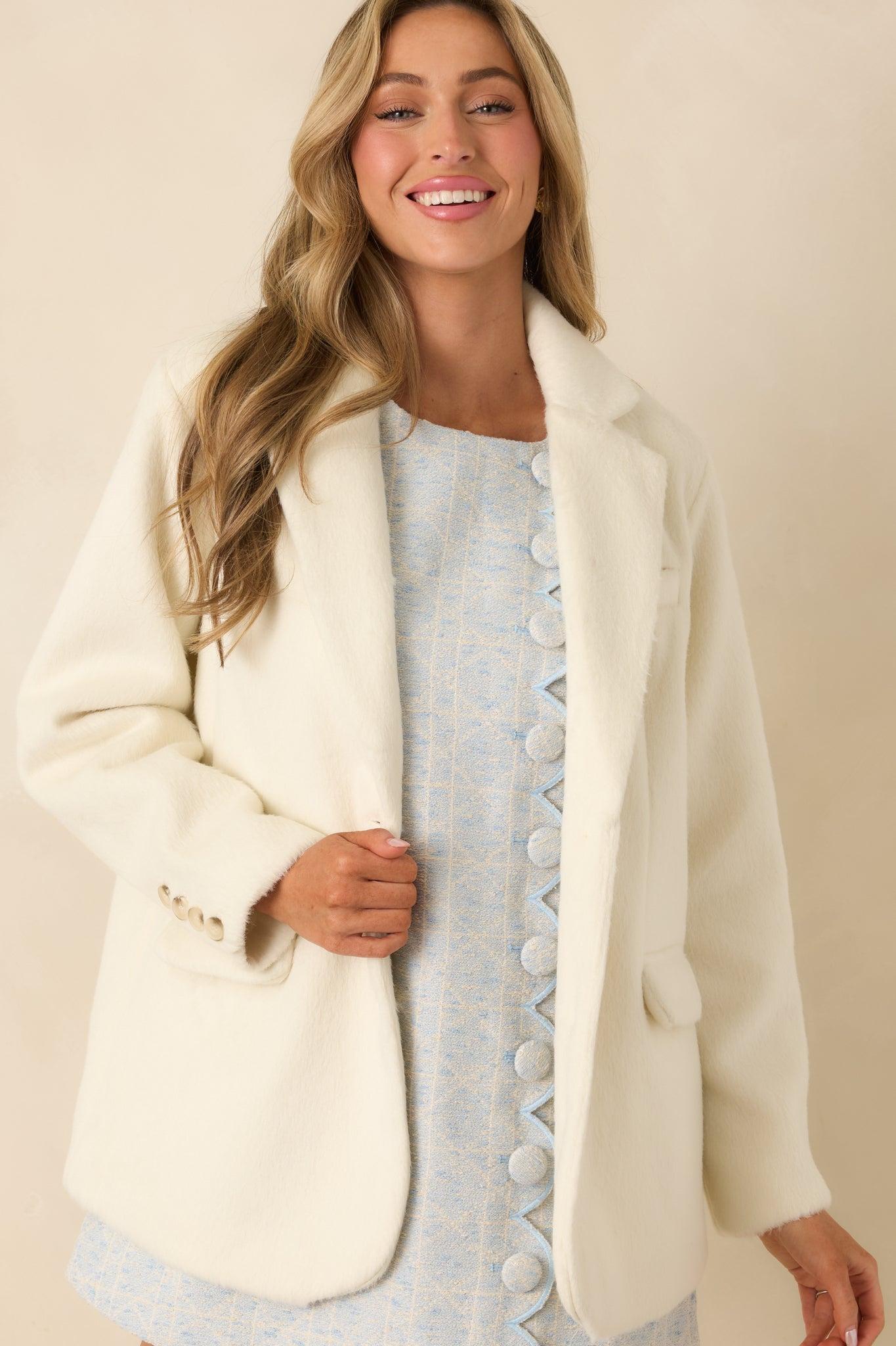 Soft, structured, and endlessly wearable. The Winds of Change Ivory Felted Coat brings a cozy elegance to your layering lineup with its plush felted texture and classic tailored shape. It’s the kind of piece that instantly makes any outfit feel finished—whether you’re dressing up denim, layering over a dress, or heading into cooler days with a polished mindset. This ivory blazer is crafted from a felted fabric and features a classic notched lapel collar with a clean open-front design. Details include long sleeves, a chest welt pocket, and functional front flap pockets. Designed with a relaxed yet tailored silhouette, it offers easy layering while maintaining a structured look. 100% PolyesterLining: 100% PolyesterHand Wash ColdManufactured in ChinaDesigned in the USAModel is 5'8" and wearing size x-small