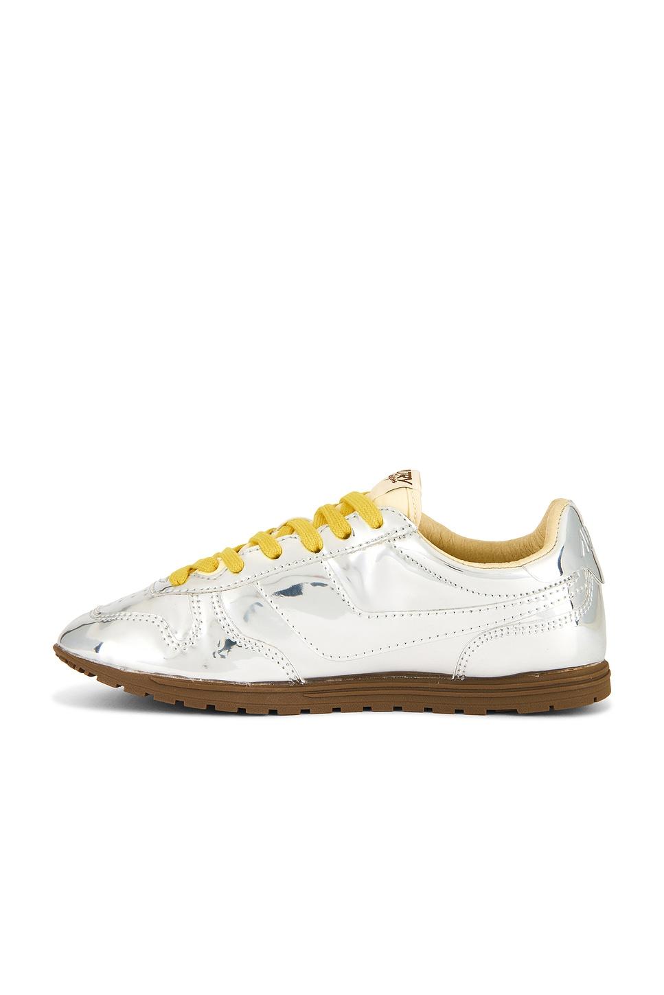 Metallic patent leather upper with rubber sole. Lace-up front. Padded tongue and collar with stitch logo detail. Autry embossed logo at back counter. Perforated toe. Made in Indonesia. Revolve Style No. ATRY-WZ38. Manufacturer Style No. WSLW-RY01.