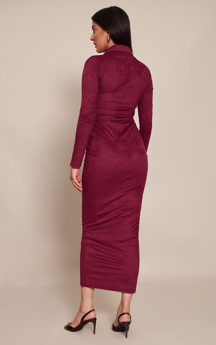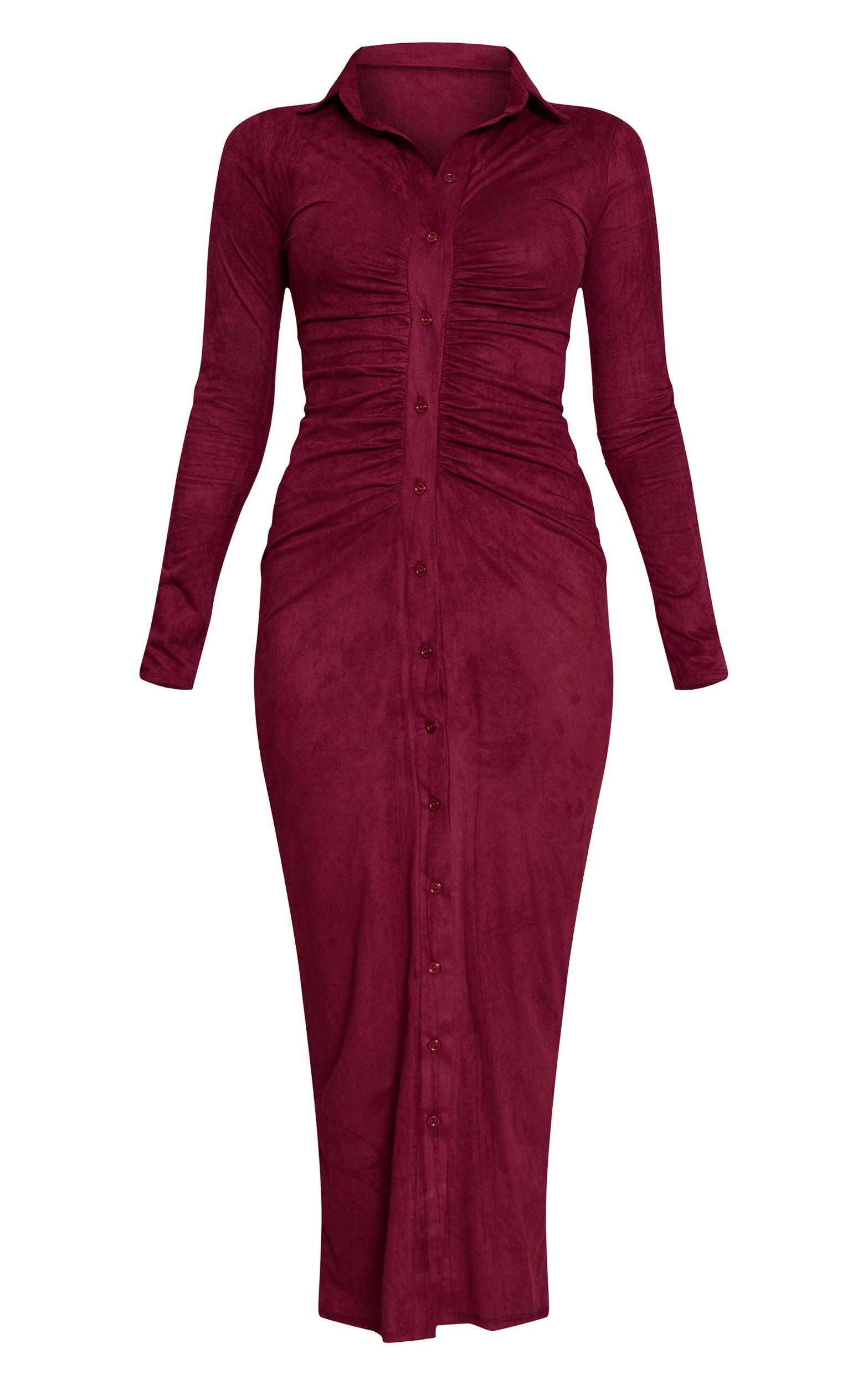 Own the day in the wine faux suede long sleeve ruched button up maxi dress. Its design boasts a collared neckline, long sleeves, full button-front, and ruched bodycon maxi fit. Perfect for elevated daytime plans or a chic brunch. Team with sleek black heels and polished gold hoops for a confident finish.Length approx 155cm/61inch (Based on sample size US 4)Model wears size UK 8/ EU 36/ AUS 8/ US 4Model Height - 5ft 9inchp]:!mb-4inch>Brand: PrettyLittleThingCategory: DressesProduct type: Bodycon DressColor: WineMaterial: Faux SuedeSleeves: LongOccasion: Day