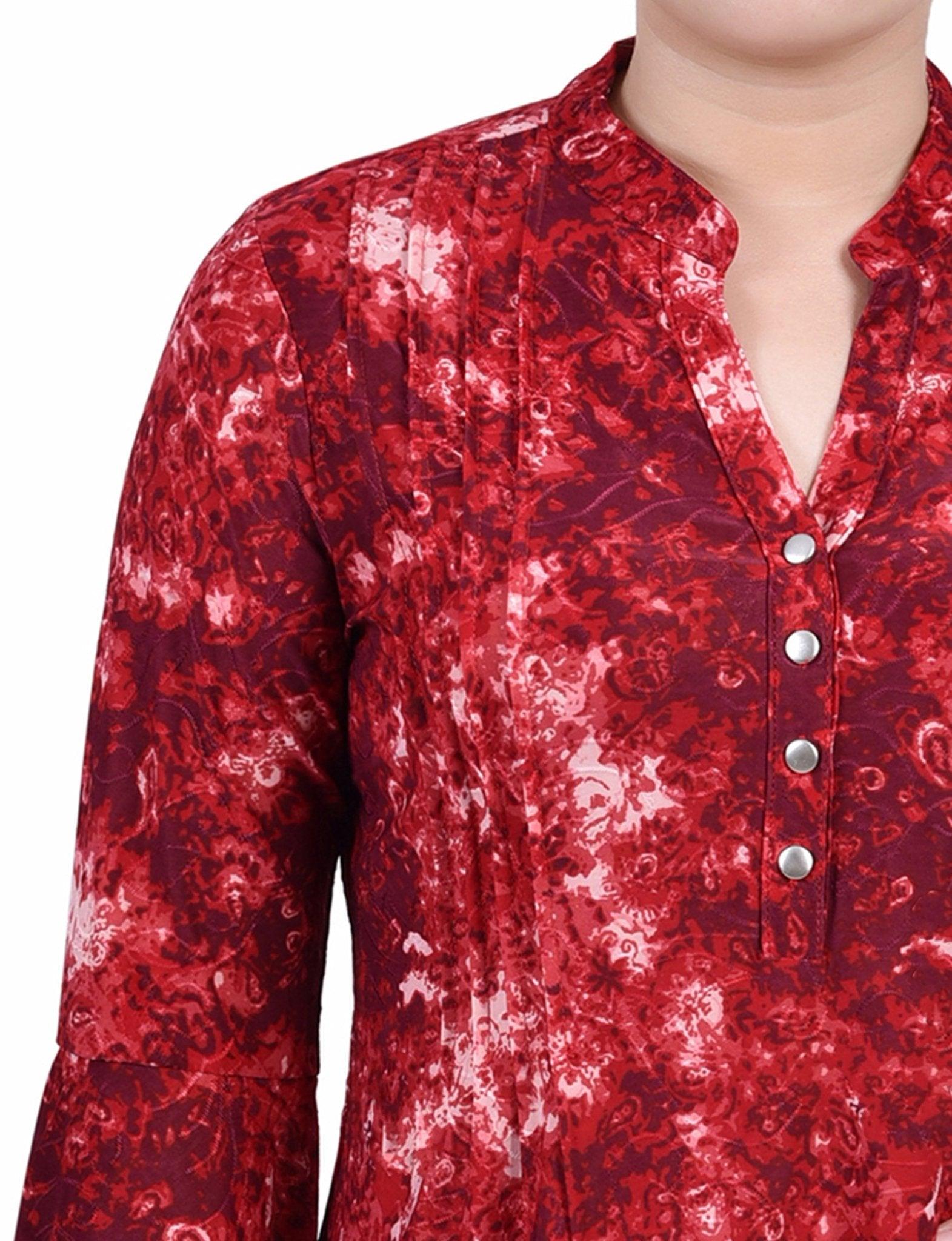 Wine Geobreeze 3/4 Bell Sleeve Pleat Front Y Neck Top - Petite