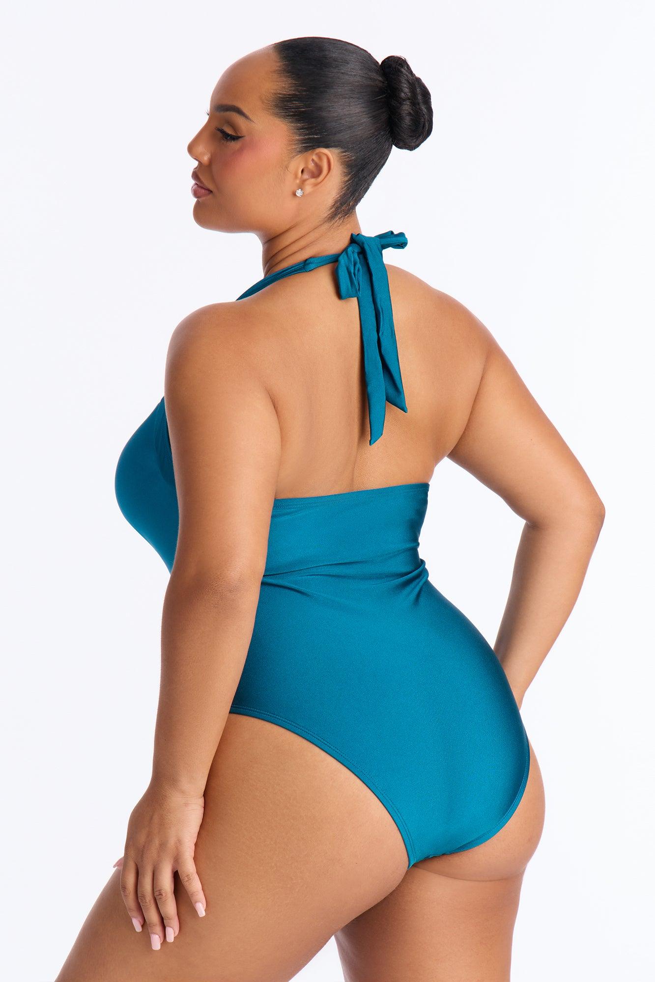 Available In Emerald And Navy. 1 Piece Swimsuit Wireless Molded Cups Halter Neck Ties Sweetheart Neckline Ruching Detail Cheeky Full Stretch Final Sale Shell: 82% Nylon 18% Spandex Lining: 95% Polyester 5% Spandex Imported