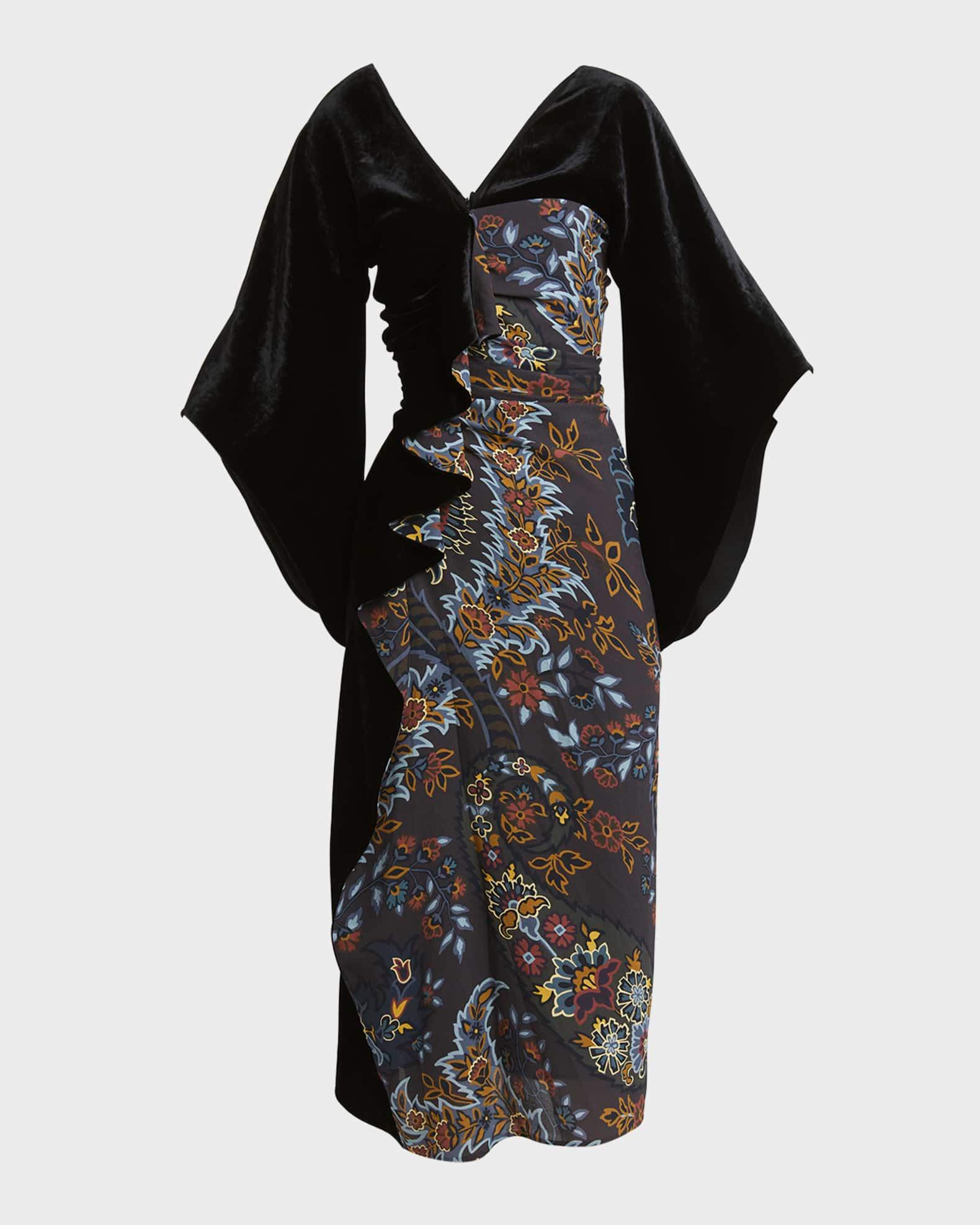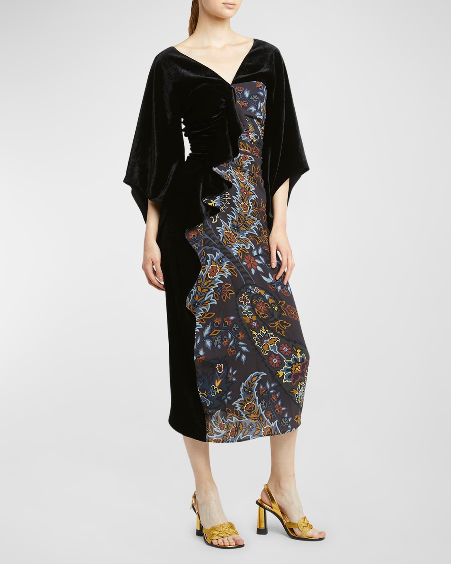 Etro velvet kimono dress featuring winter garden paisley printed panel and a ruffle front detail V neckline 3/4 kimono sleeves A-line silhouette Hem falls below the knee Invisible back zip Viscose/elastane Made in Italy Model is 5'10"/177cm.