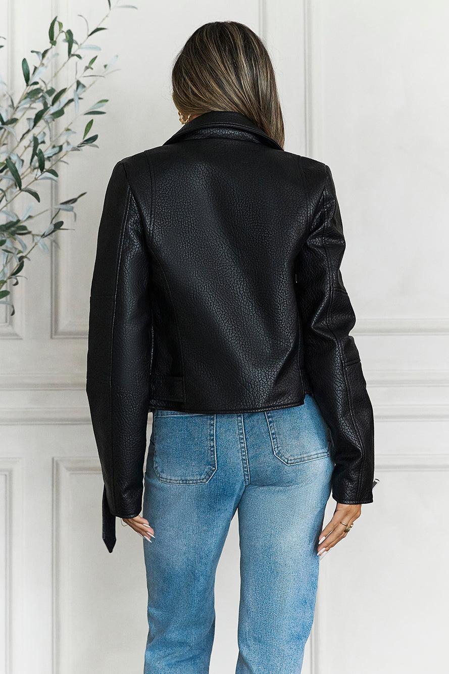 Length from shoulder to hem of size S: 52cm. Faux leather jacket. Lined. Model is a standard XS and is wearing a size XS. True to size. Non-stretch. Two functional side pockets; one faux zip. Zip sleeve cuff. Silver hardware. Removable belt hem. Pebbled design. Zip closure. Cold hand wash only. Polyester/Polyurethane. Please Note: This product is a Hello Molly Exclusive. Channel your inner fashionista with the HELLO MOLLY Winter Romance Faux Pebbled Leather Jacket. Featuring two side pockets, silver hardware and a removable belt hem. Style with all your 'fits for a little edge!