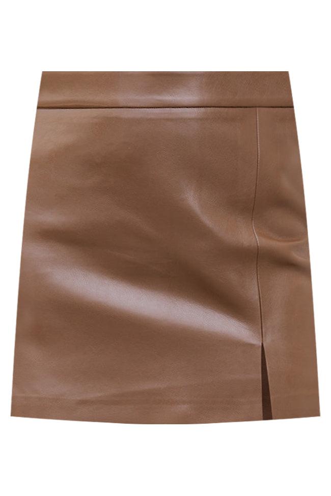 Details Brown Faux Leather Mini Skirt Fabric has no stretch Zipper closure in the back Pair this skirt with your favorite blouse and sandals! Unlined Size small from waist to hem: 15.5" Material and Care 55% polyester / 45% PU Hand wash cold, hang to dry Patterns may vary Materials may have natural variations Colors may vary from different viewing devices.