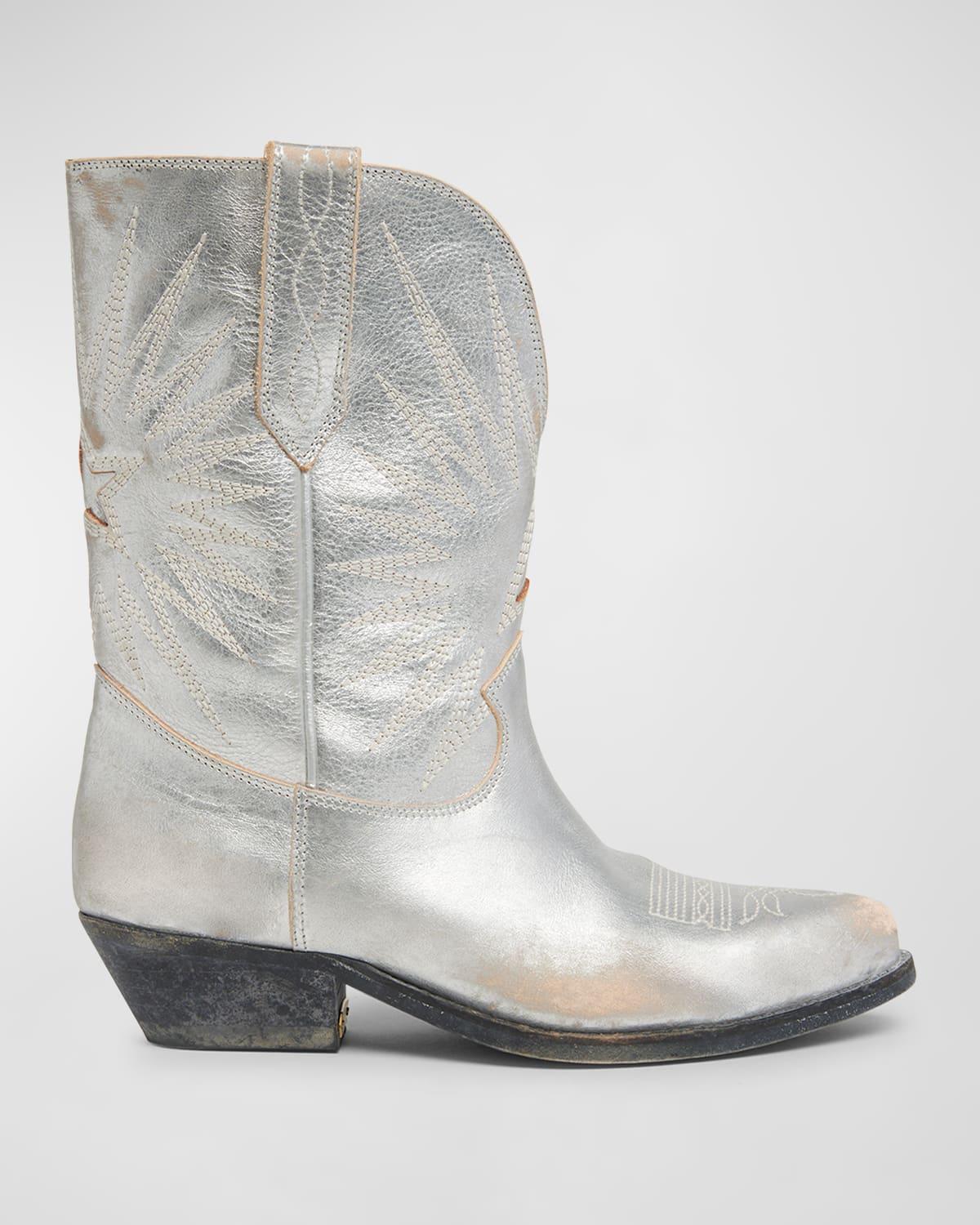 Golden Goose Wish Star Low Boots in Silver - Metallic Silver. Size 37 (also in 35, 36, 38, 39, 40, 41). Laminated metallic leather upper with leather sole. Made in Italy. Pull-on styling. Leather footbed and lining. Dual side pull-tabs. Western inspired stitching throughout. Intentionally scuffed and distressed. Approx 45mm/ 1.75 inch heel Approx 222mm/ 8.75 inch shaft. GGOO-WZ479. GWF00136.F005495.70100. About the designer: Founded in 2000 by Italian designers Francesca Rinaldo and Alessandro Gallo, Golden Goose offers collections for men and women rich modern shape and traditional leather craftsmanship. The line continually tests the boundaries of fashion, often experimenting with new materials, production methods, and mixing traditional Italian techniques with classic British tailoring.