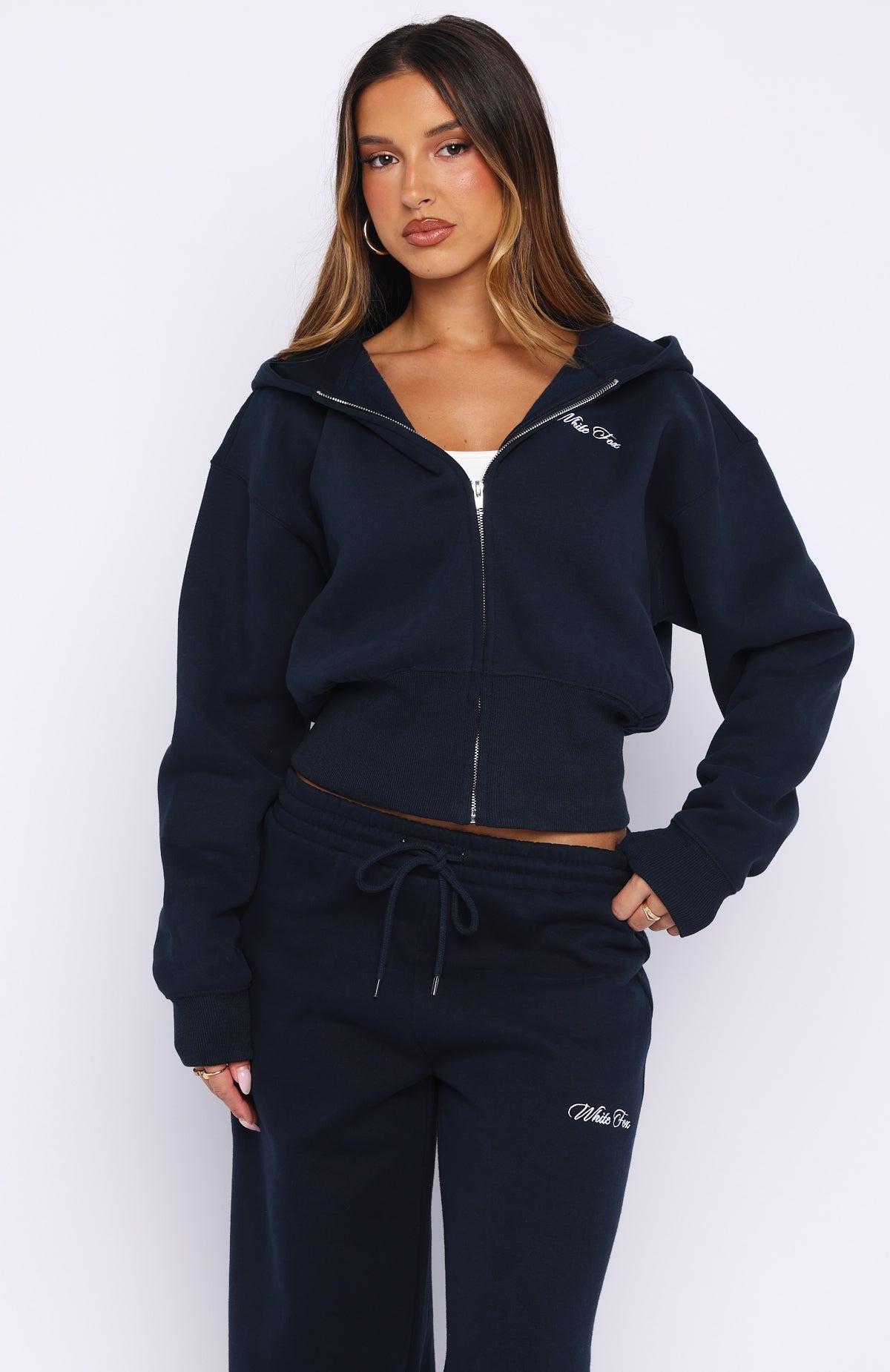 Perfect for lounging or running errands, the Wishing For It Cropped Cinched Zip Front Hoodie Navy is here to keep you comfy. Featuring a centre front zip closure, elasticated ribbed cuffs & ultra thick hem, hood, soft fleeced fabric for extra comfort, cropped length and embroidered logo detailing side front. - Hood - Relaxed Fit - Long Sleeves - Cropped Length - Ribbed Cuffs - Thick Ribbed Hem Band