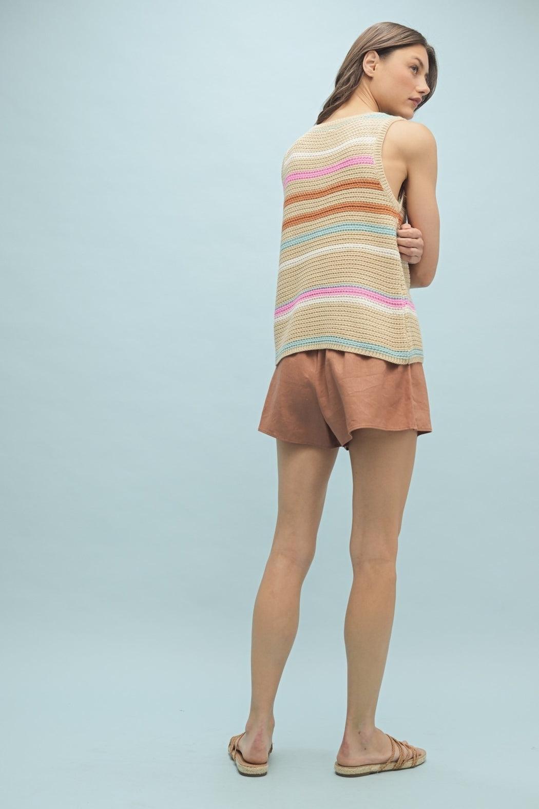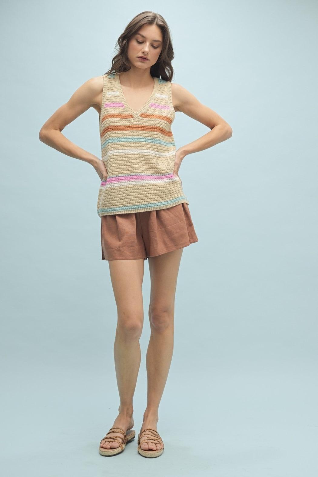 Add a playful pop of color to your wardrobe with this multi-color striped sweater tank. Featuring a soft knit texture and a relaxed, easy fit, it’s perfect for layering or wearing solo on sunny days. The vibrant stripes and V-neckline give it a fun, laid-back vibe that pairs effortlessly with shorts, denim, or flowy skirts.