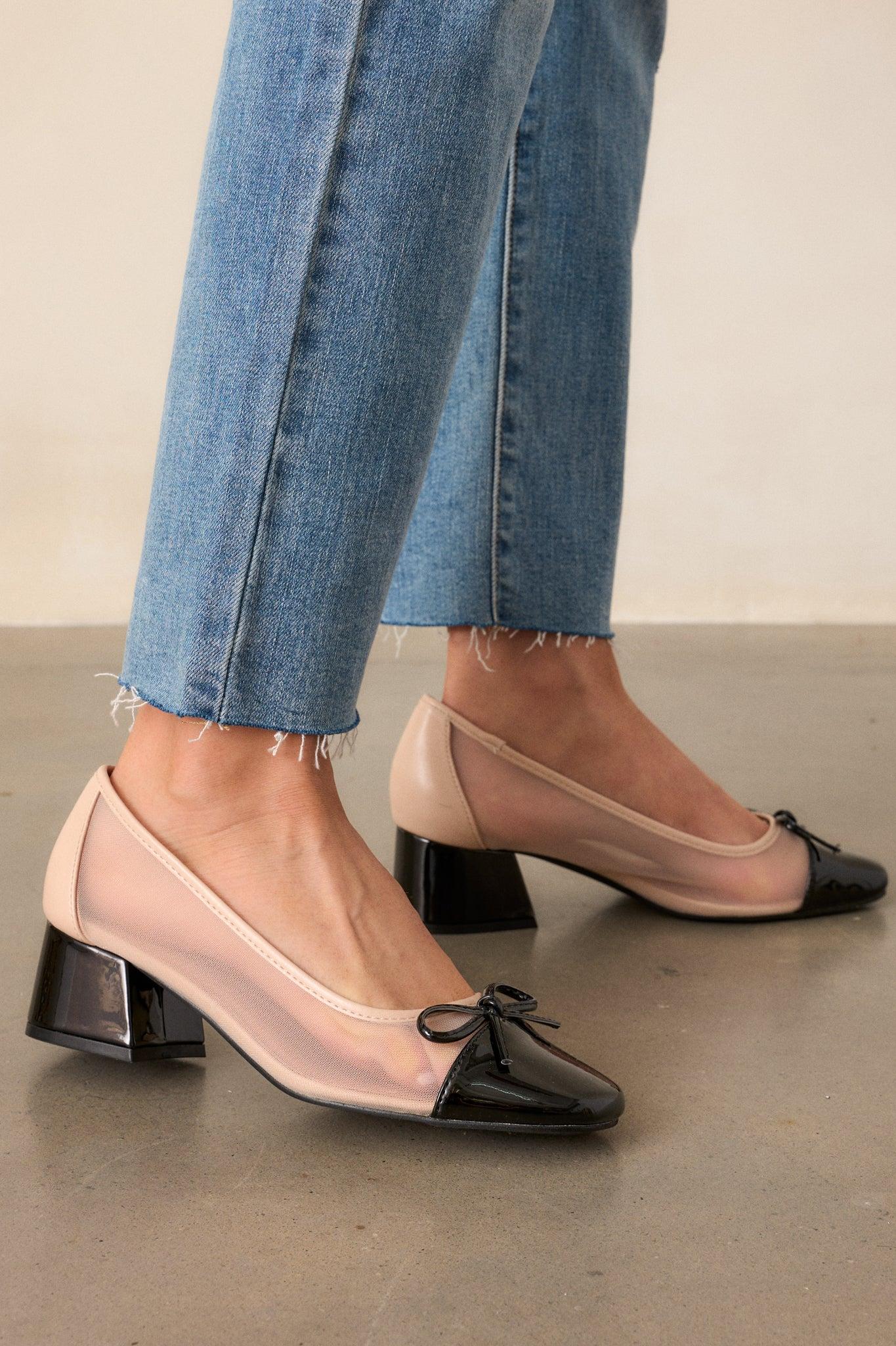 Stay comfortable and stylish with our With Every Step Beige & Black Block Heel Ballet Pumps. These pumps feature a trendy block heel for added stability and a chic color combination. Perfect for any occasion, these shoes will keep you confident and supported with every step. These beige and black heels feature a glossy black square toe, a black slim bow on the toe, a beige mesh material on the sides, a solid beige heel piece and a black block heel.