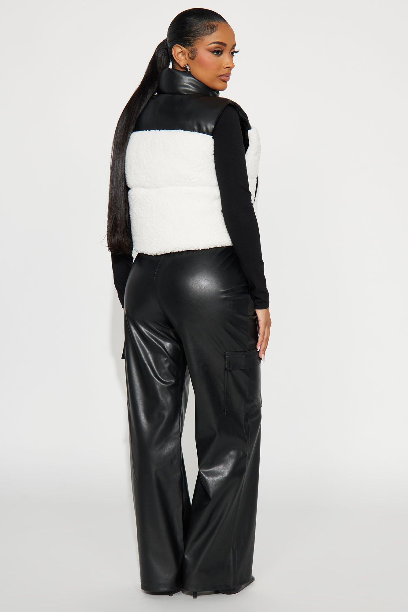 Available In Black/combo. Faux Leather Pant Set Sherpa Vest Zip Up Pockets Drawstring Waist Cargo Pant Stretch Self/Filling/Lining: 100% Polyester Pant Self: 100% Polyester Imported California Proposition 65WARNING: Cancer and Reproductive Harm - www.P65Warnings.ca.gov.