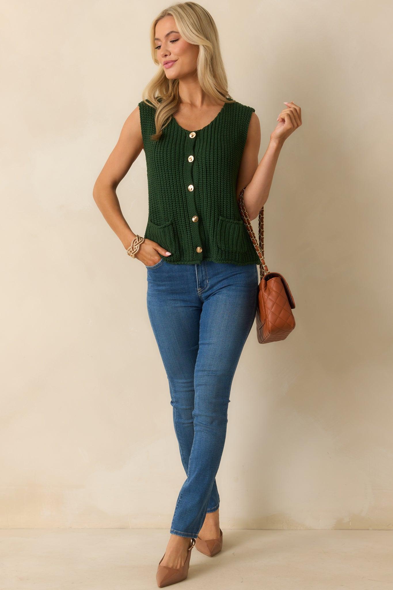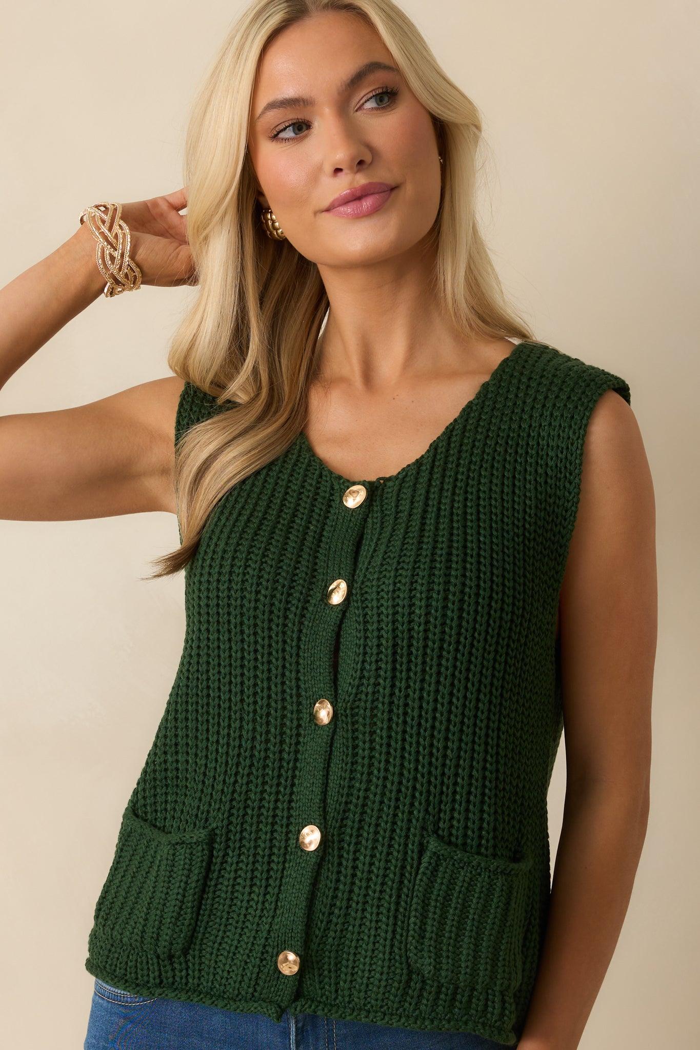 The Without Hesitation Hunter Green Knit Button Front Sweater Vest has an effortless confidence, giving you a chic and versatile layer that instantly pulls your look together. This hunter green sweater vest features a ribbed knit fabric, scoop neckline, sleeveless design, hammered gold button front closure, functional front patch pockets, and a straight hemline. 100% Acrylic Unlined Hand Wash Cold Manufactured in China Designed in The USA Model is 5'6" and is Wearing a Size Small