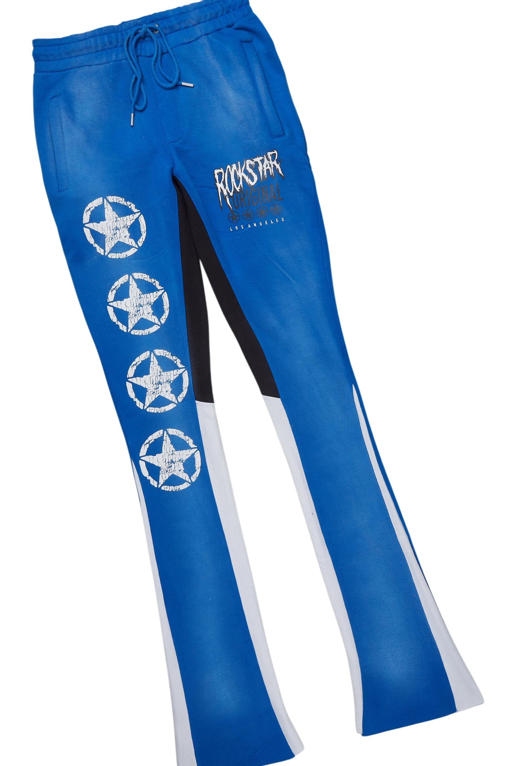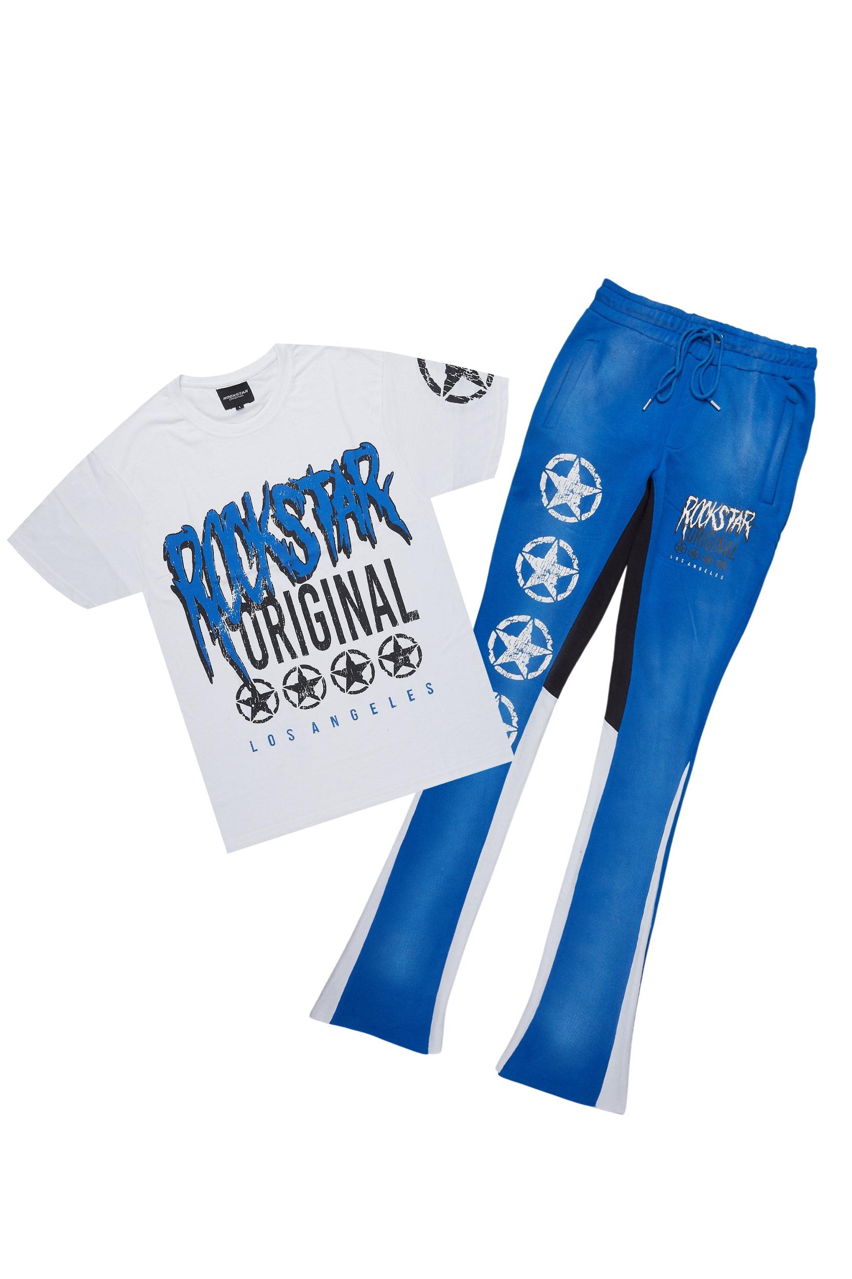 An urban two-piece t-shirt and stacked pant tracksuit set for men in blue. Designed with ultra soft fabric and extra long legs for a dope streetwear set. Rounded neckline Short sleeves Regular fit Drawstring waistband Slant pockets Color block designing Printed RSO logos Stacked construction 35.75" seams *NOTE: These pants are purposefully designed with extra long legs so the fabric properly bunches at the hem, creating the stacked flare style.