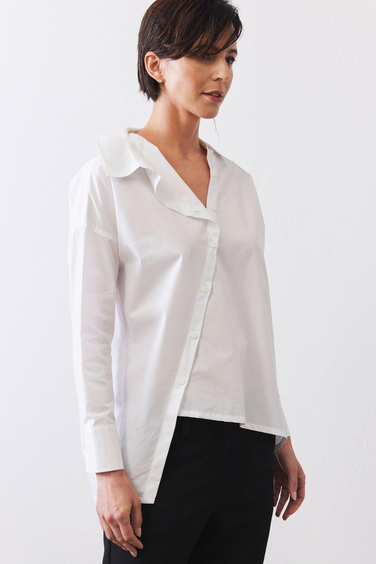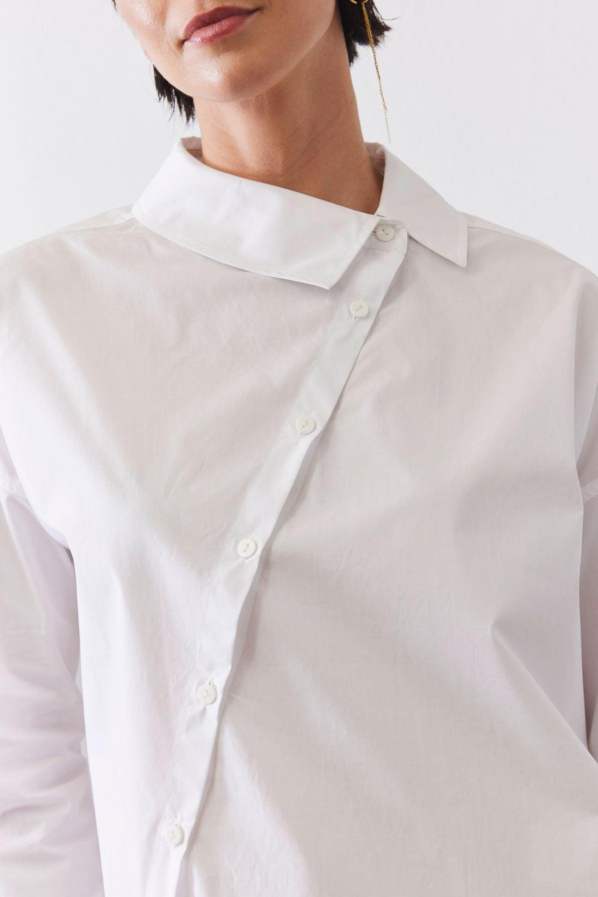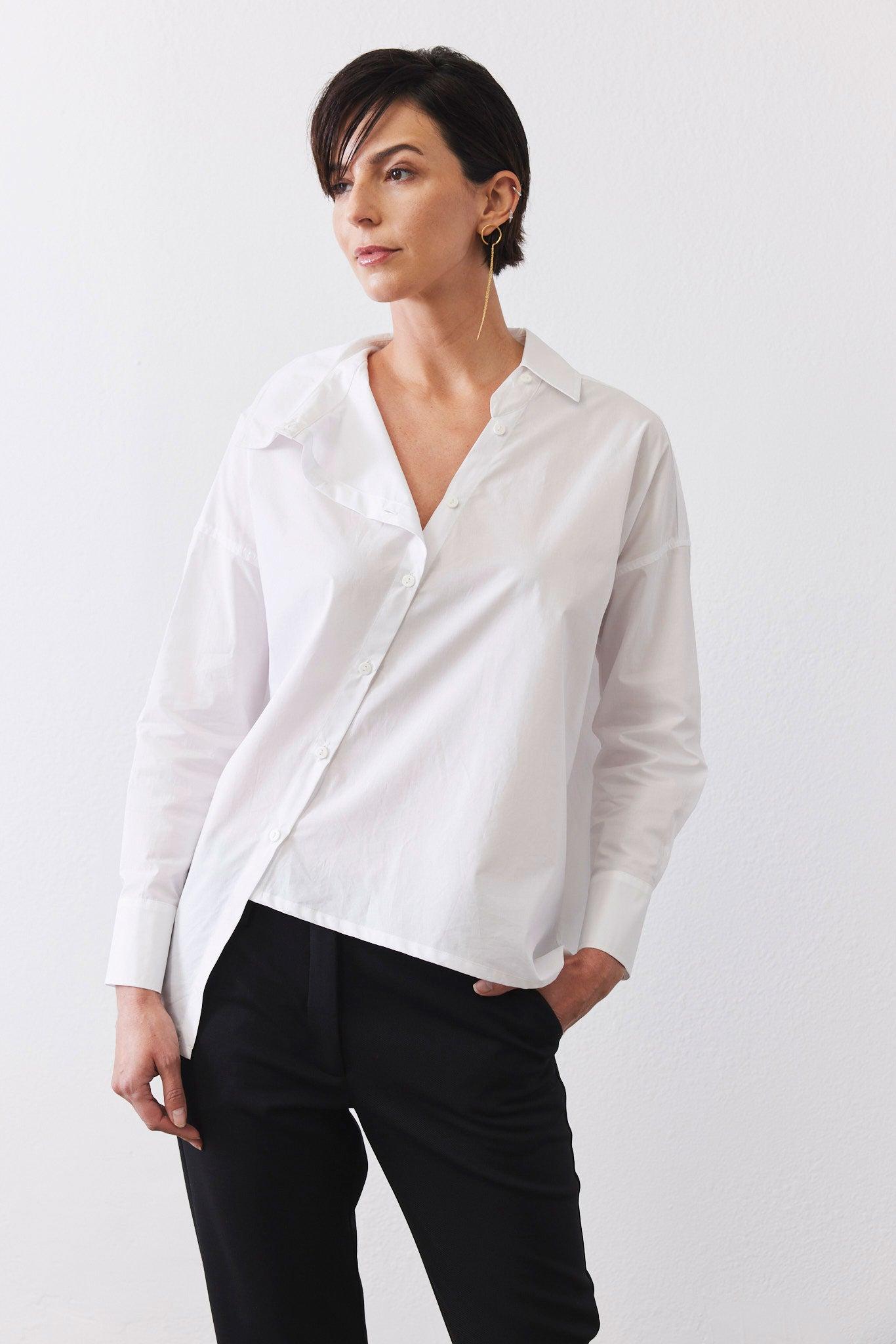 A modern button-down with an asymmetrical front closure for a unique, fashion-forward edge. Featuring a structured collar and long sleeves, it blends classic tailoring with contemporary sophistication.