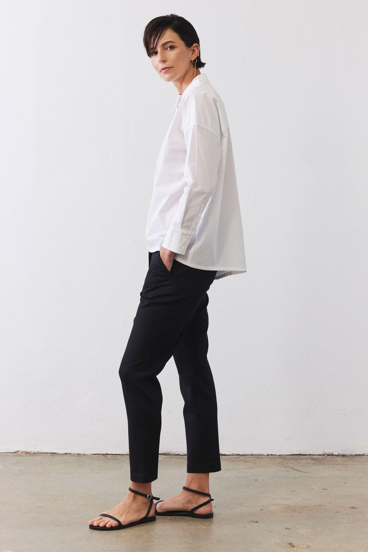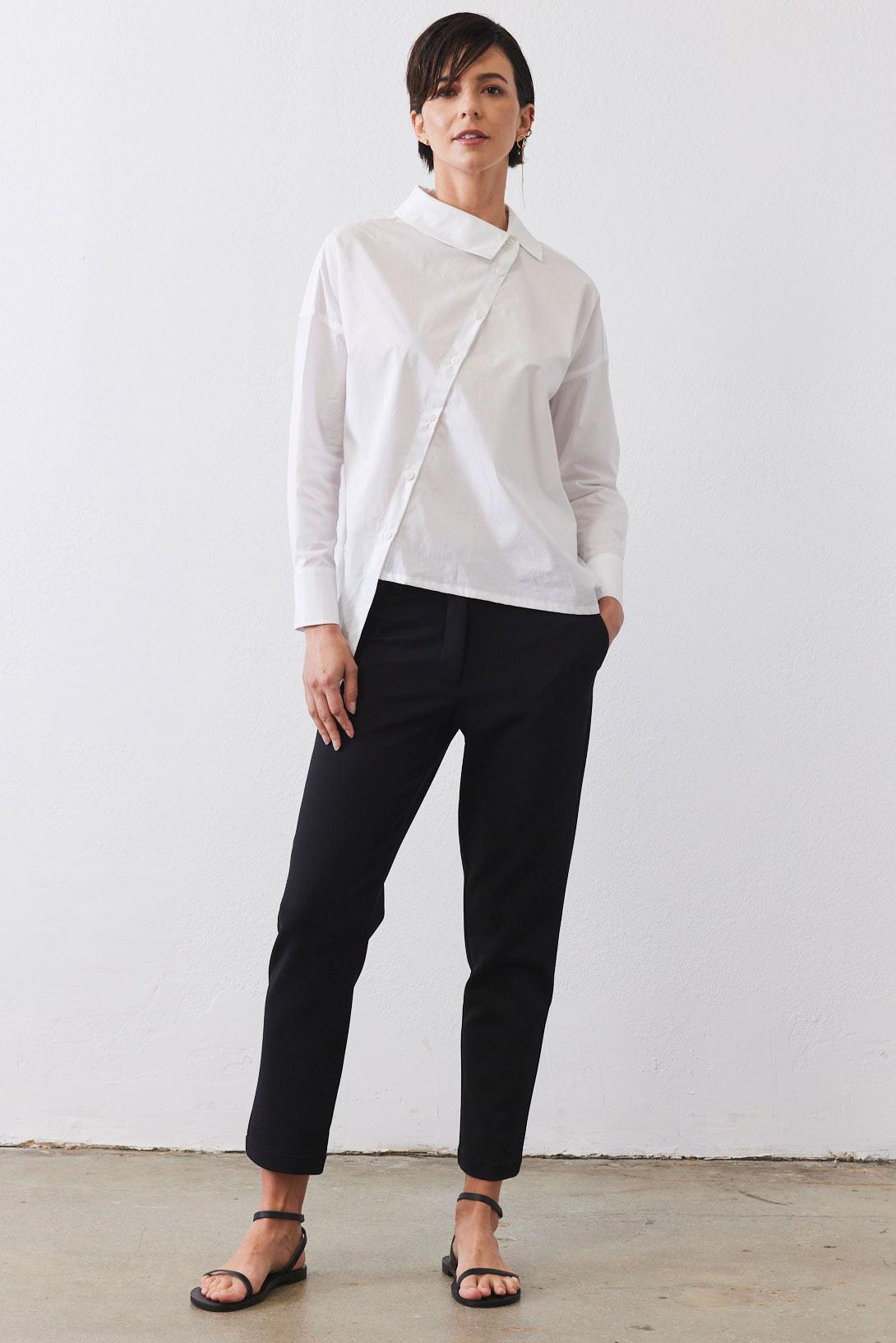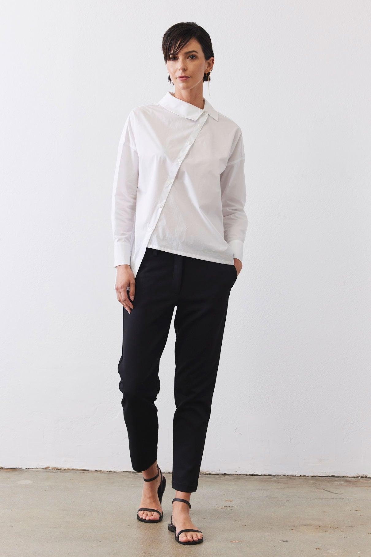 A modern button-down with an asymmetrical front closure for a unique, fashion-forward edge. Featuring a structured collar and long sleeves, it blends classic tailoring with contemporary sophistication.
