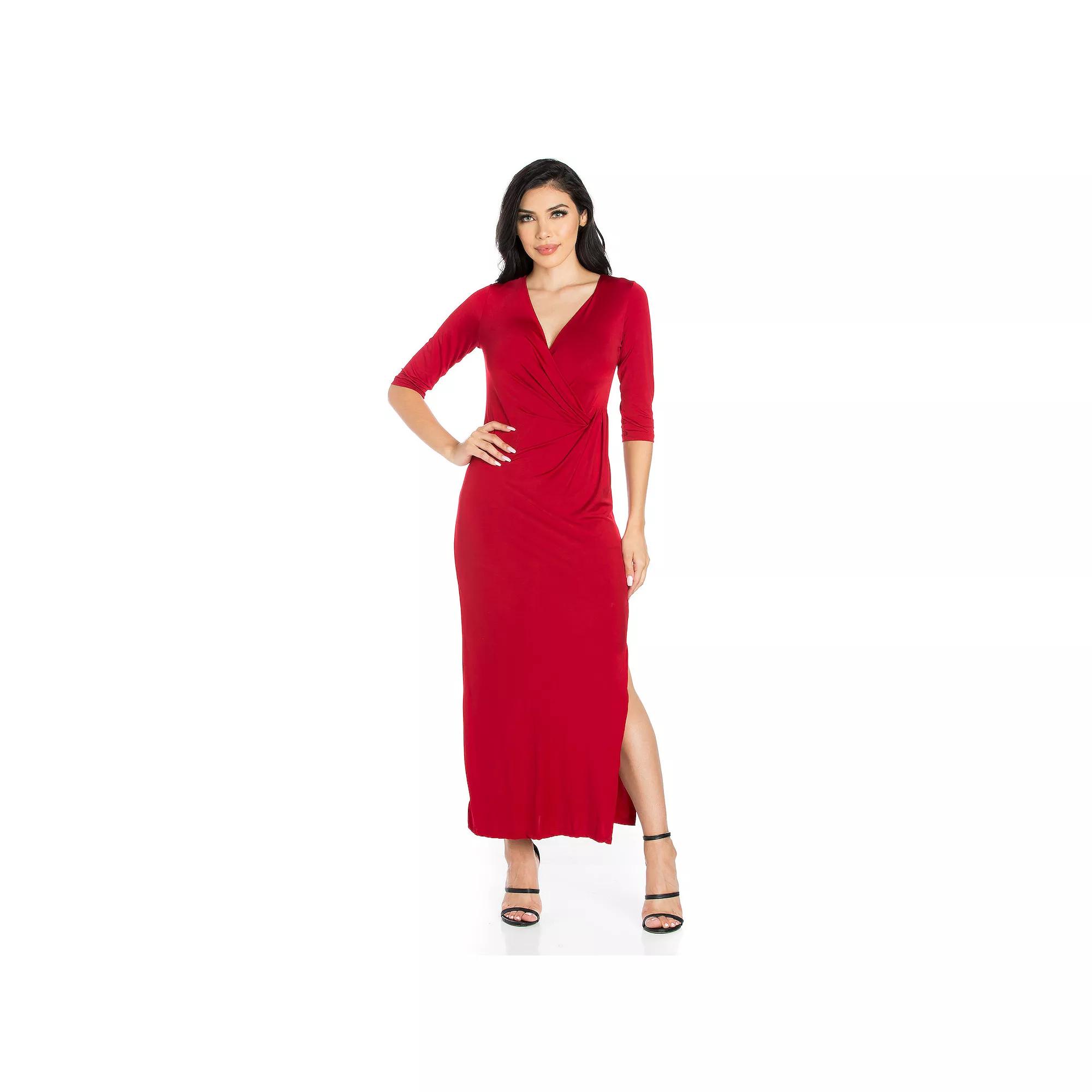 With its chic mid-thigh slit and sleek figure-flattering cut, this juniors faux-wrap evening dress from 24seven Comfort Apparel is bound to be your new fave. With its chic mid-thigh slit and sleek figure-flattering cut, this womens faux-wrap evening dress from 24seven Comfort Apparel is bound to be your new fave. V-neck Faux-wrap detail Three-quarter sleeves Side slit No pockets Unlined Jersey constructionFIT & SIZING Maxi silhouette 55-in. approximate lengthFABRIC & CARE Polyester, spandex Machine wash Imported Size: Medium. Color: Red. Gender: female. Age Group: adult. Pattern: Solid.