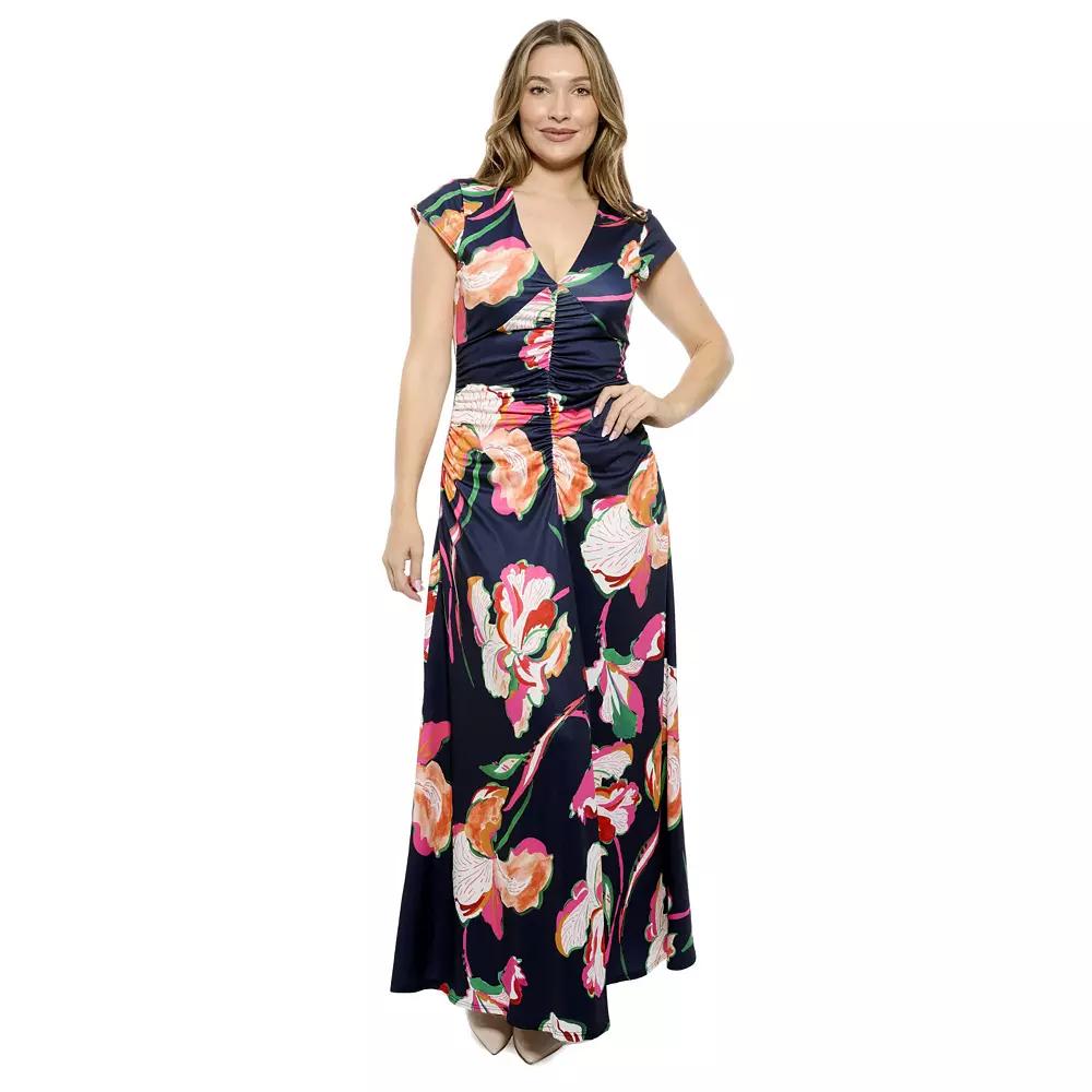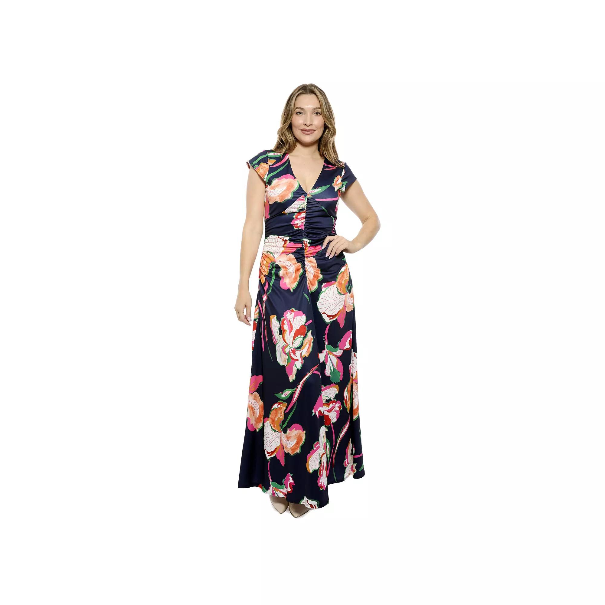 Embrace effortless elegance with this stunning maxi dress from 24Seven Comfort Apparel, designed to make you feel like the best version of yourself. Its flattering V-neck and ruched front detail create an inviting silhouette, perfect for everything from summer brunches to romantic evenings under the stars. Click on this WOMEN'S GUIDE to find the perfect fit and more! - https://www.kohls.com/feature/womens-fit-guide.jsp. FEATURES: Soft fabric with stretch, Model height: Approx. 5' 7" and wearing size S. FIT & SIZE: A-line silhouette, 54 1/2 in. from shoulder to hem, Maxi length hits at the ankle, Straight hem. MATERIAL & CARE: Body: 92% Polyester, 8% Spandex, Machine wash and tumble dry. DETAILS: No closure - pullover styling, V-neck, Cap sleeves, Imported. Size: Small. Color: Navy Team. Gender: female. Age Group: adult. Pattern: floral. Material: POLY BLEND.