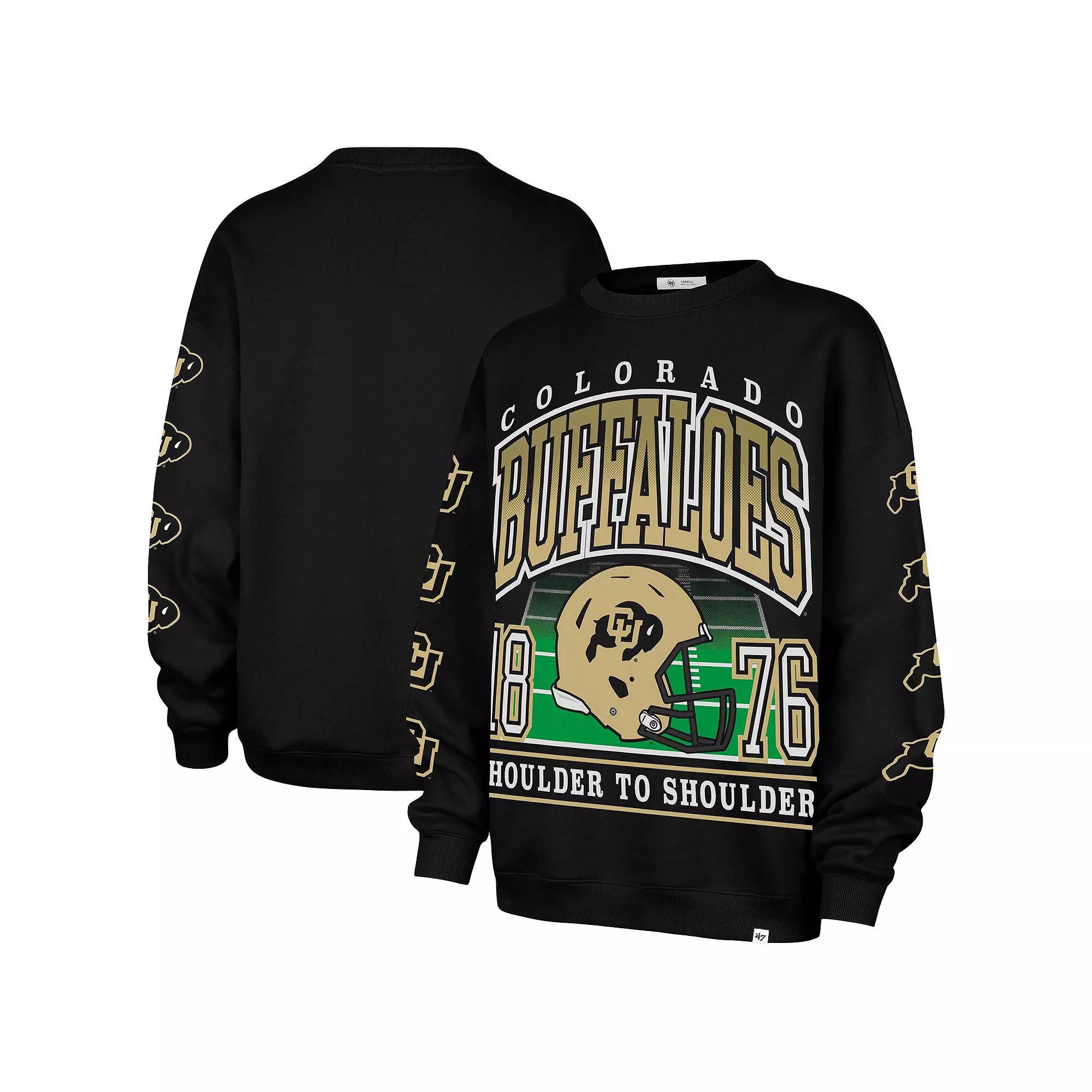Stay cozy while showing your love for the Colorado Buffaloes in this Go Big Oversized Pullover Sweatshirt from '47. The oversized fit provides a comfortable and relaxed feel, perfect for layering or lounging. Plus, the screen print team graphics add a touch of team spirit, making this sweatshirt a standout piece in your Colorado Buffaloes collection. Brand: '47. Oversized Fit: Intentionally designed for a spacious feel and laidback look. Midweight pullover suitable for moderate temperatures. Material: 60% Cotton/40% Polyester. Machine wash, tumble dry low. Screen print team graphics on chest and arms. Officially licensed. Crew neck. Long sleeve. Rib knit cuffs and hem. Pullover. Imported. Size: XL. Color: Black. Gender: female. Age Group: adult.