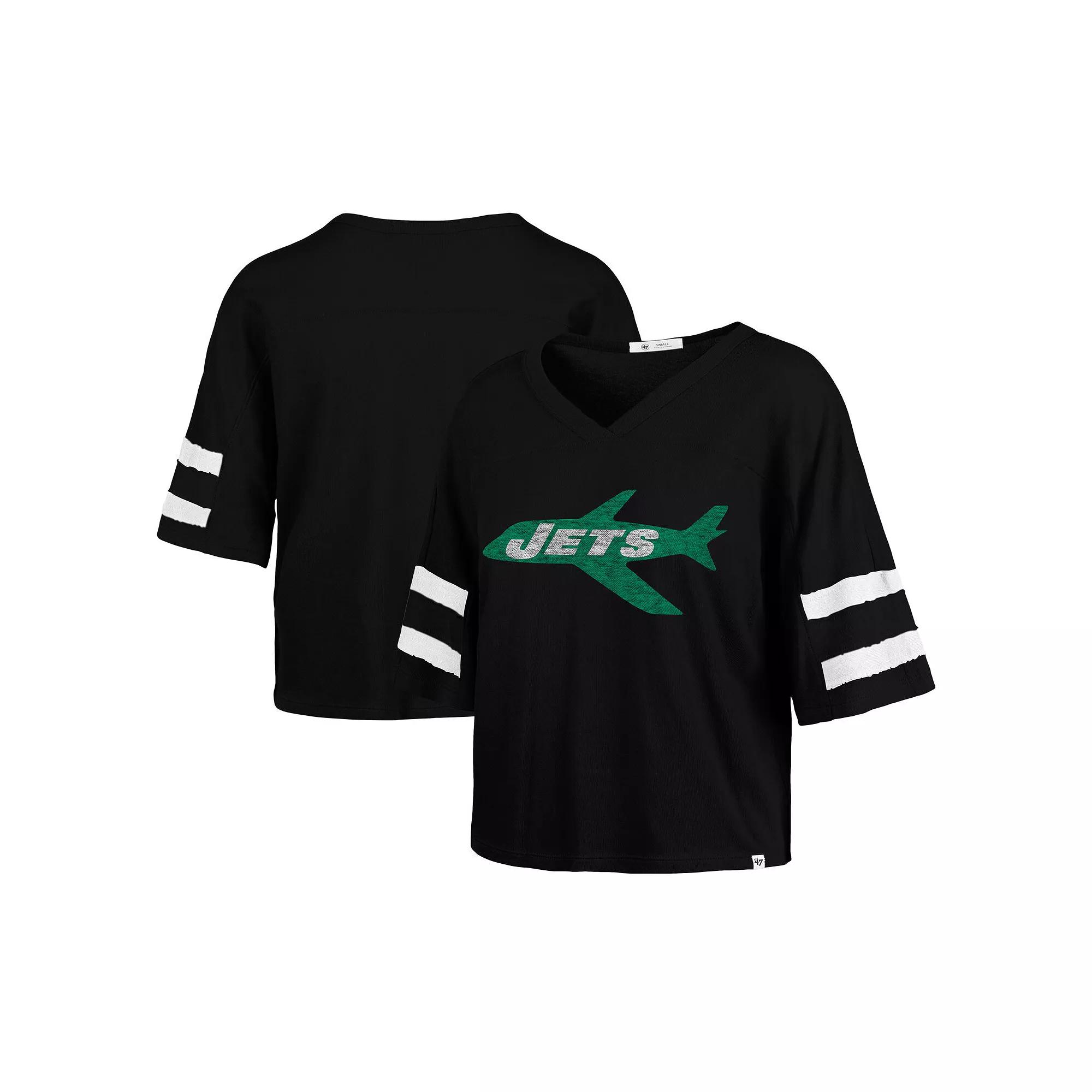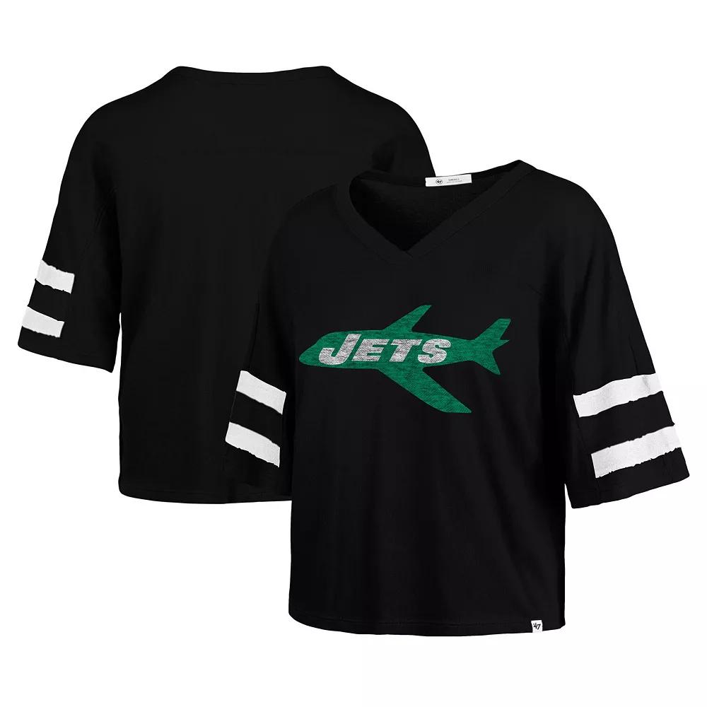 Embrace effortless style while cheering on your favorite team with this New York Jets Double Header Scout Cropped V-Neck T-Shirt from 47. This stylish cropped tee features a distressed New York Jets logo printed across the chest for a vintage-inspired look. The soft, 100% cotton fabric and flattering V-neckline make it perfect for casual game days or everyday wear.Embrace effortless style while cheering on your favorite team with this New York Jets Double Header Scout Cropped V-Neck T-Shirt from 47. This stylish cropped tee features a distressed New York Jets logo printed across the chest for a vintage-inspired look. The soft, 100% cotton fabric and flattering V-neckline make it perfect for casual game days or everyday wear.PRODUCT FEATURESMaterial: 100% CottonMachine wash, tumble dry lowBrand: 47Officially licensedV-neckShort sleeveTeam logo printed across chest in a distressed designImportedCropped hem adds a stylish and modern aesthetic Color: Black. Gender: female. Age Group: adult.