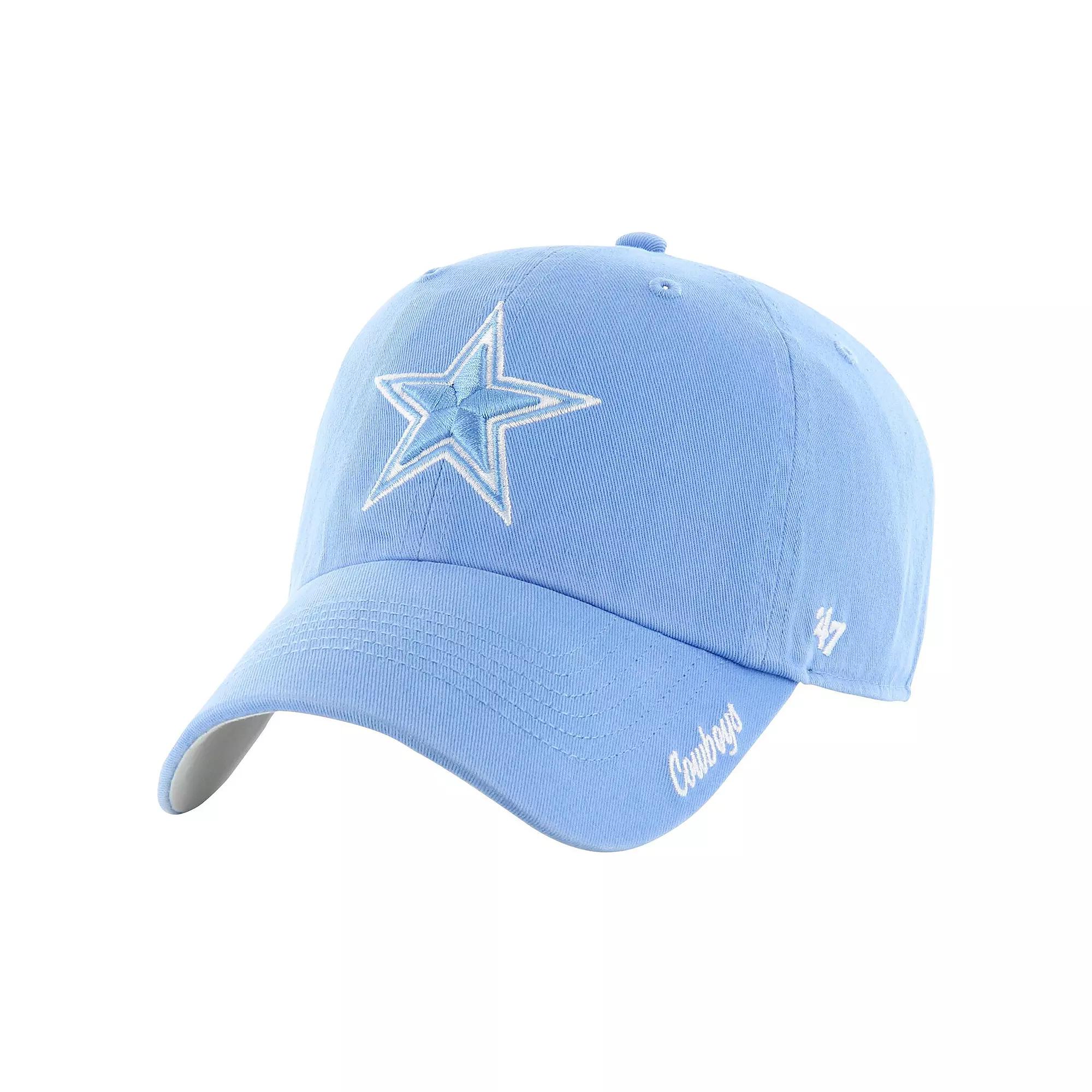 Rep your Dallas Cowboys with this '47 Luminance Cheer Clean Up Adjustable Hat. Made with 100% cotton for ultimate comfort, this hat features an embroidered team logo across the front panels and script on the bill, ensuring your fandom is front and center. The adjustable fabric strap with a snap buckle closure allows for a customizable fit, making it perfect for every Cowboys fan. Adjustable fabric strap with snap buckle. Officially licensed. Imported. Unstructured relaxed fit. Embroidered team logo across the front panels with script on the bill. Material: 100% Cotton. Contrast-color undervisor. Curved bill. Low Crown. Brand: '47. One size fits most. Wipe clean with a damp cloth. Six panels with eyelets. Color: Blue. Gender: female. Age Group: adult.