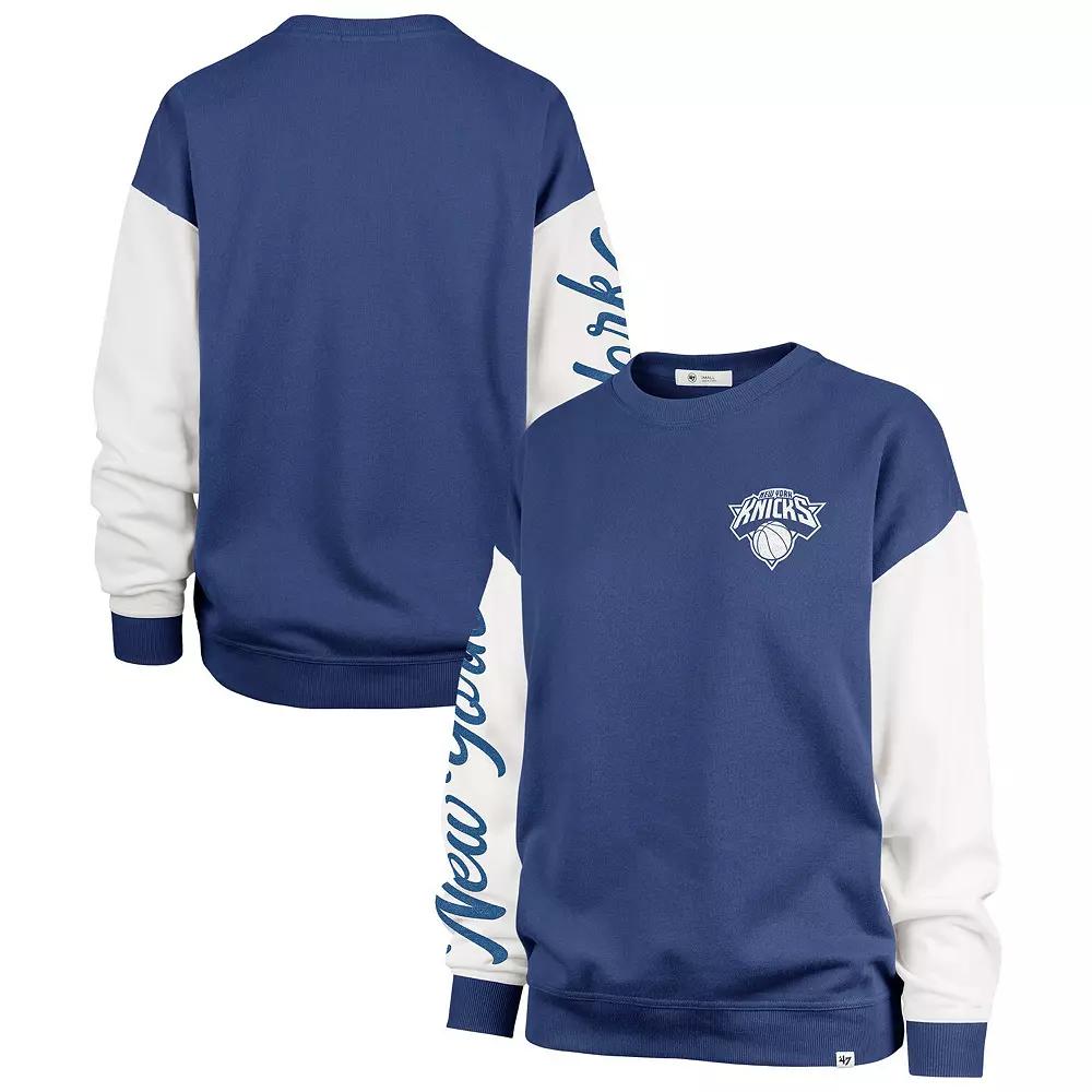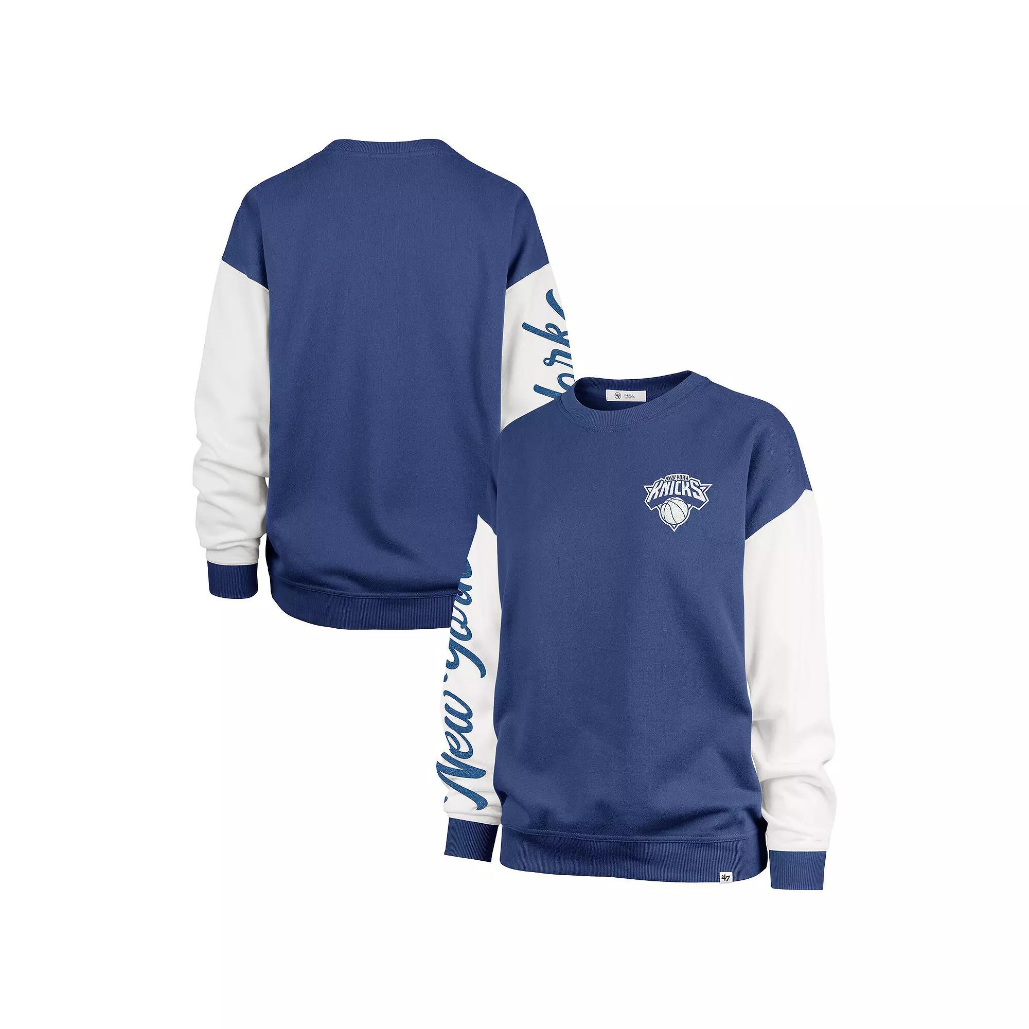 Channel your love for the New York Knicks in this '47 Rise Andie Oversized Pullover Sweatshirt. This oversized sweatshirt provides a spacious, relaxed feel with its dropped shoulders and trendy design. The monochrome team logo screen printed on the left chest and the team's location down the right sleeve allow you to rep your Knicks in style.Channel your love for the New York Knicks in this '47 Rise Andie Oversized Pullover Sweatshirt. This oversized sweatshirt provides a spacious, relaxed feel with its dropped shoulders and trendy design. The monochrome team logo screen printed on the left chest and the team's location down the right sleeve allow you to rep your Knicks in style.PRODUCT FEATURESMonochrome team logo screen printed on left chestPulloverMidweight sweatshirt suitable for moderate temperaturesBrand: '47Long sleeveTeam's location printed down the right sleeveImportedMachine wash, tumble dry lowDropped shoulders provide a trendy look and relaxed fitMaterial: 60% Cotton/40% PolyesterOversized design creates a spacious feelOfficially licensed Color: Blue. Gender: female. Age Group: adult.