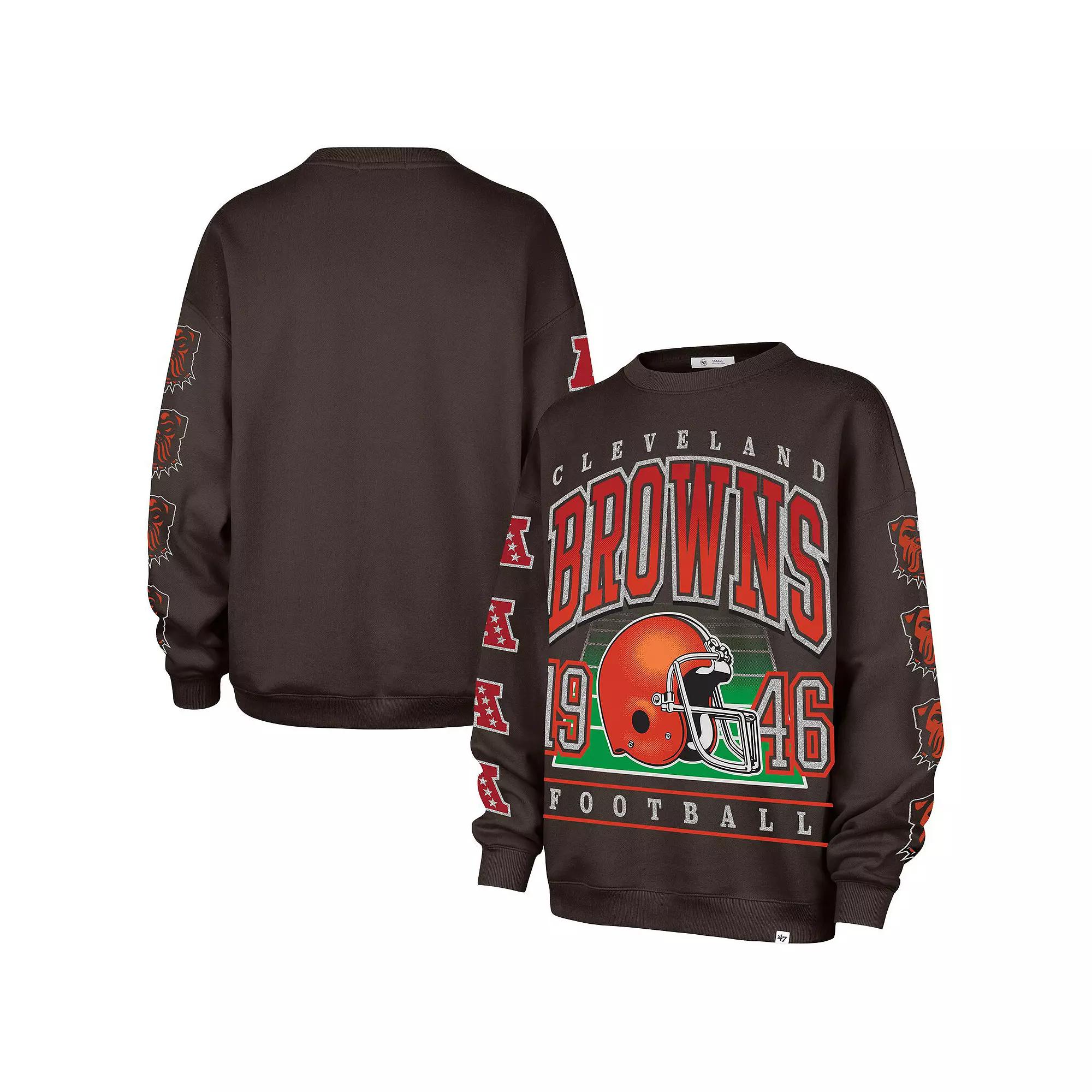 Stay cozy while showing off your team pride in this Cleveland Browns Go Big Oversized Pullover Sweatshirt from '47. The oversized fit provides a comfortable and relaxed feel, perfect for layering or lounging. The screen print team graphics with glitter details add a touch of sparkle and team pride, making this sweatshirt a standout piece in your Cleveland Browns collection. Long sleeve. Pullover. Material: 60% Cotton/40% Polyester. Oversized fit. Officially licensed. Machine wash, tumble dry low. Screen print team graphics with glitter details. Brand: '47. Midweight pullover suitable for moderate temperatures. Crew neck. Imported. Rib knit cuffs and hem. Size: XL. Gender: female. Age Group: adult.