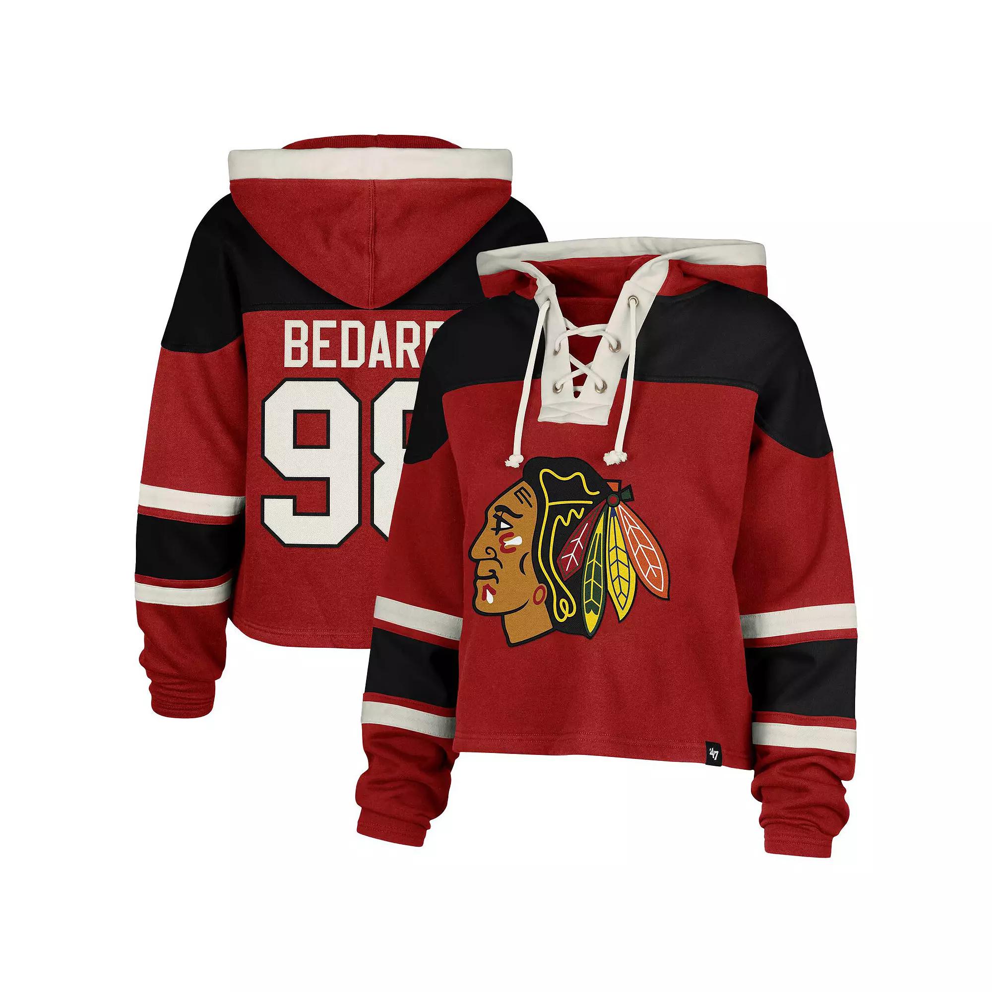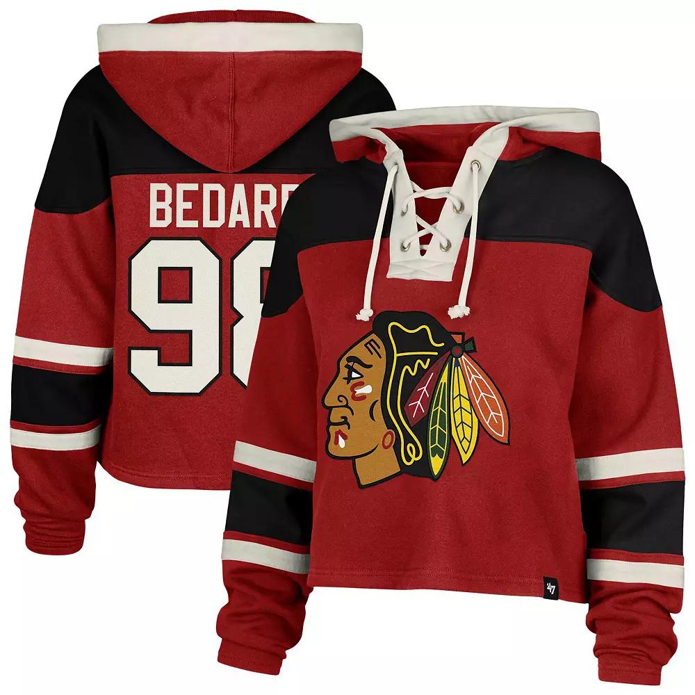 Boost your Chicago Blackhawks fandom with this stylish Connor Bedard Superior Lacer Cropped Pullover Hoodie from 47. The embroidered applique player and team graphics on this Chicago Blackhawks hoodie offer a textured, high-quality look thats sure to turn heads. Plus, with its cozy fleece lining and midweight construction, its the perfect top for staying warm and stylish throughout the hockey season.Boost your Chicago Blackhawks fandom with this stylish Connor Bedard Superior Lacer Cropped Pullover Hoodie from 47. The embroidered applique player and team graphics on this Chicago Blackhawks hoodie offer a textured, high-quality look thats sure to turn heads. Plus, with its cozy fleece lining and midweight construction, its the perfect top for staying warm and stylish throughout the hockey season.PRODUCT FEATURESBrand: 47Machine wash, tumble dry lowImportedEmbroidered applique player and team graphicsHoodedMaterial: 80% Cotton/20% PolyesterPulloverLong sleeveOfficially licensedMidweight hoodie suitable for moderate temperaturesFleece lining Gender: female. Age Group: adult.