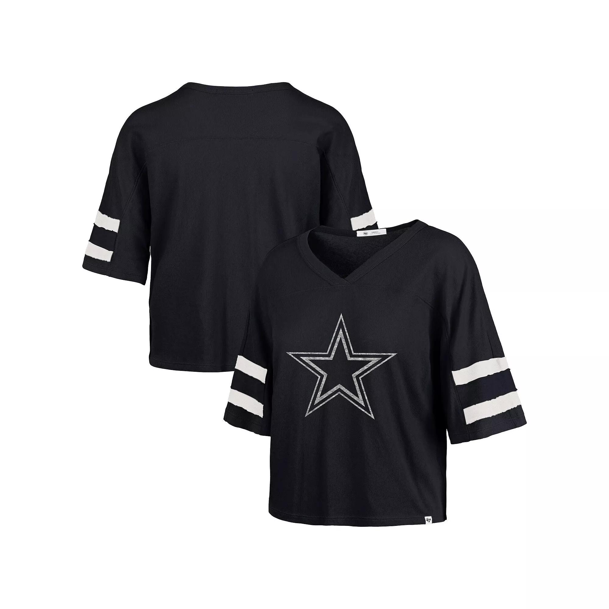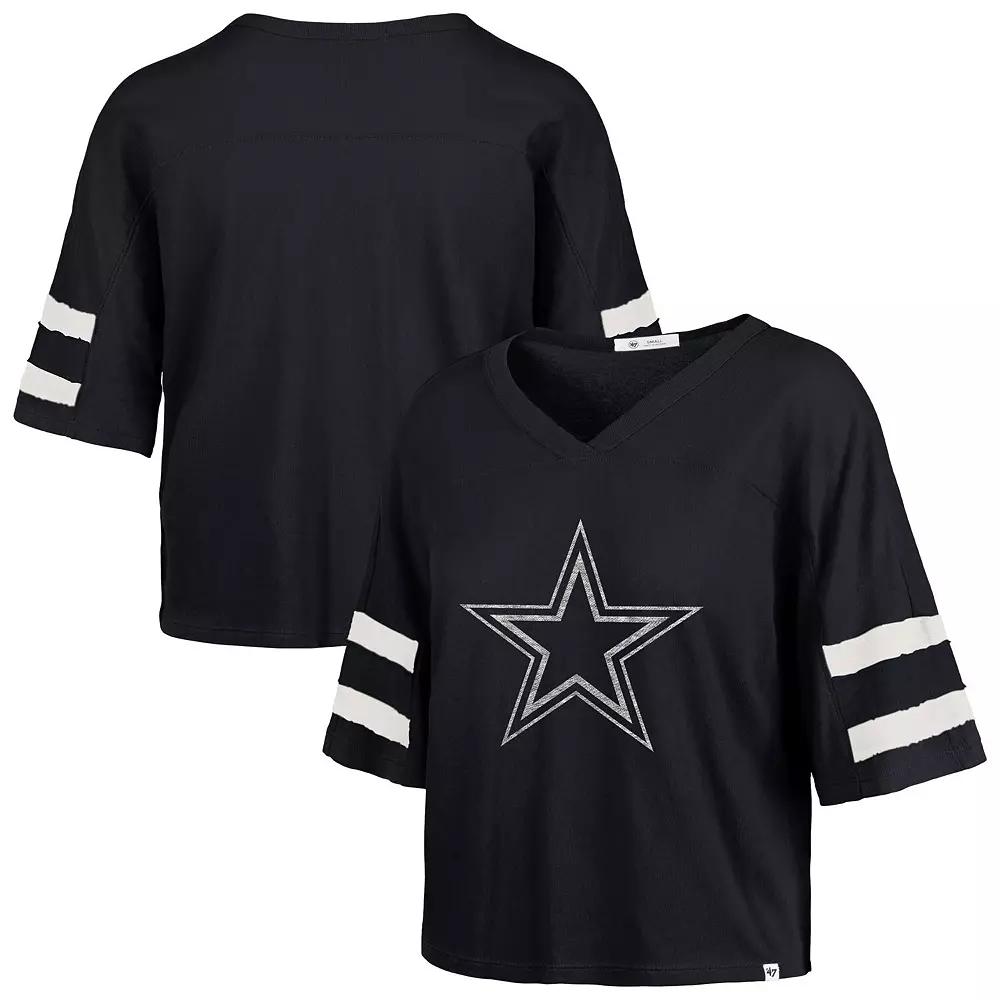 Throw it back to the good ol' days and display your Dallas Cowboys pride with this vintage-inspired, Premier Scout Cropped V-Neck T-Shirt from '47. The team logo is printed across the chest in a distressed design and contrast-color stripes sewn onto the sleeves with a raw edge give it a classic, worn-in look. The cropped hem adds a modern, stylish touch to this oversized fit tee. Finished with a woven brand clip tag at the bottom hem, this tee is the perfect way to rep your team from the offseason to a celebrated playoff run. Woven brand clip tag at bottom hem. Team logo printed across chest in a distressed design. Short sleeve. Brand: '47. Imported. Cropped hem adds a stylish and modern aesthetic. Material: 100% Cotton. Officially licensed. V-neck. Machine wash, tumble dry low. Contrast-color stripes sewn onto sleeves with raw edge detail for a worn look. Special garment wash process for a vintage look. Oversized Fit: Intentionally designed with wider and longer proportions for a spacious feel and a laidback look. For a less relaxed fit, consider sizing down. Color: Navy. Gender: female. Age Group: adult.