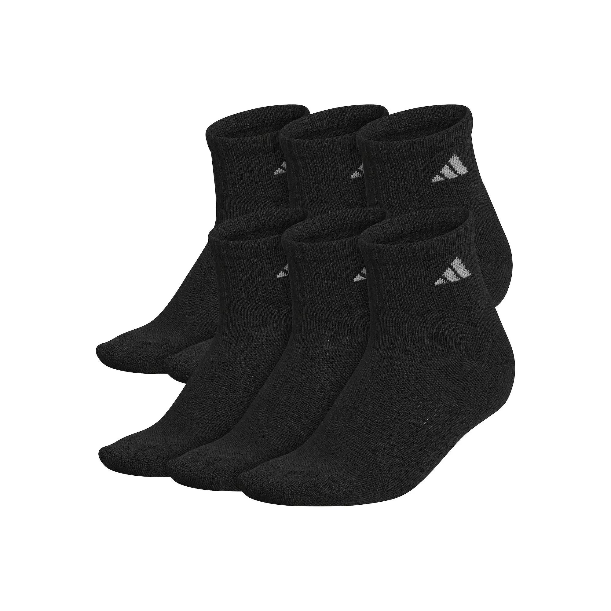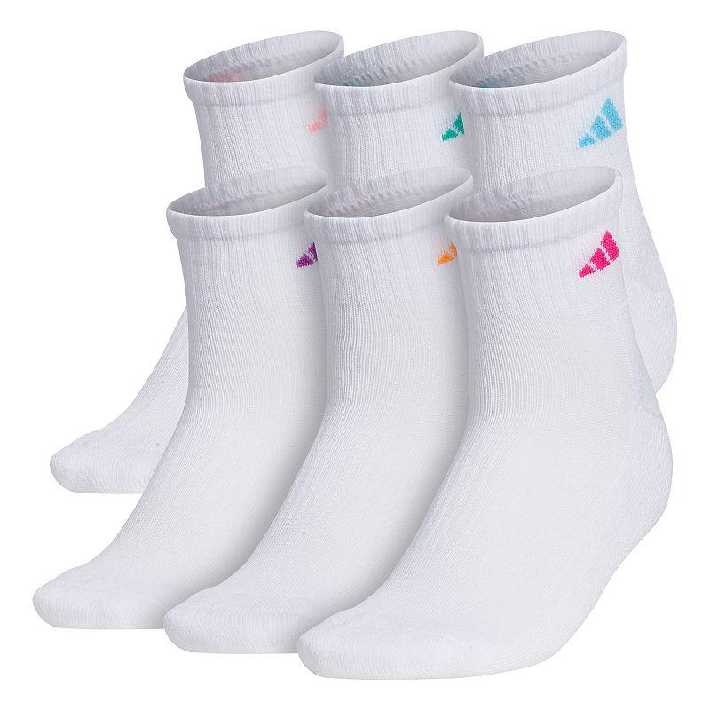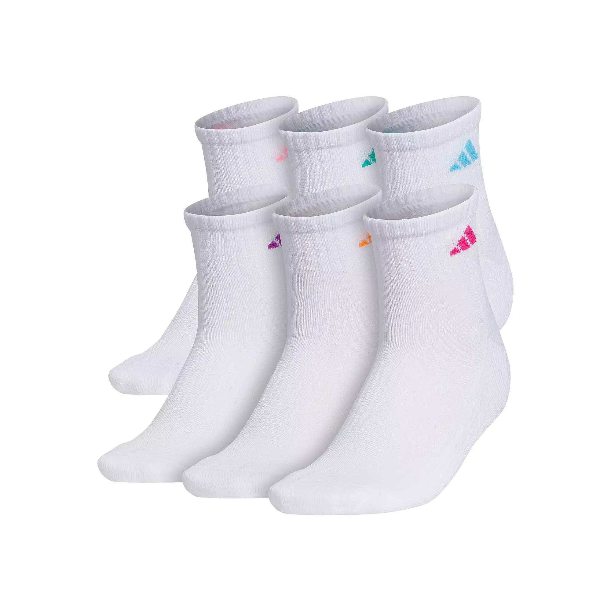 Boost your performance with the adidas Athletic Quarter Socks 6-Pack! Sold as a six-pair pack. Quarter-cut sock sits above the ankle. Lightweight polyester blend fabric. Y-stitch heel. Colorful logo at ankle. 98% polyester, 2% spandex. Machine wash cold. Tumble dry low. Imported.