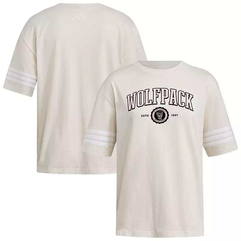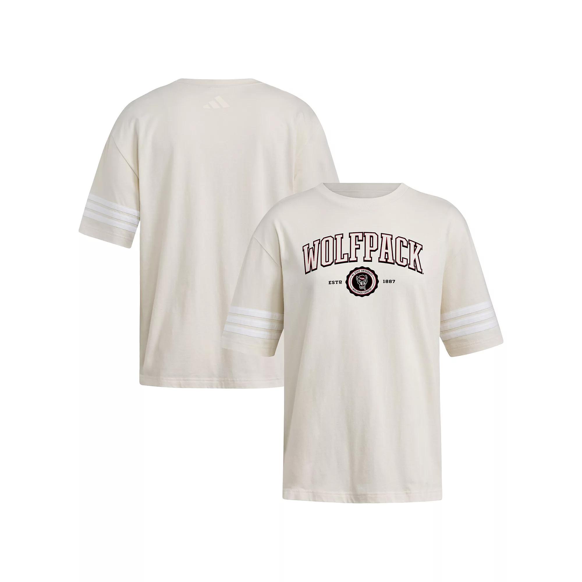 Show off your love for the NC State Wolfpack in total comfort with this Fashion T-Shirt from adidas. Perfect for game day or everyday wear, this tee is designed with cotton jersey fabric that's super-soft against the skin. The dropped shoulders provide freedom of movement, while the iconic monochrome stripes adorn each sleeve. Complete with printed team wordmark, logo, and established year on the front chest, this tee is a must-have for any dedicated fan. Imported. Material: 100% Cotton. Crew neck. Dropped shoulders for increased freedom of movement and comfort. Machine wash, tumble dry low. Distinct, monochrome stripes woven on each sleeve. Oversized Fit: Intentionally designed with wider and longer proportions for a spacious feel and a laidback look. For a less relaxed fit, consider sizing down. Officially licensed. Brand: adidas. Short sleeve. Printed team wordmark and logo with established year on front chest. Size: XL. Color: Nst Beige. Gender: female. Age Group: adult.