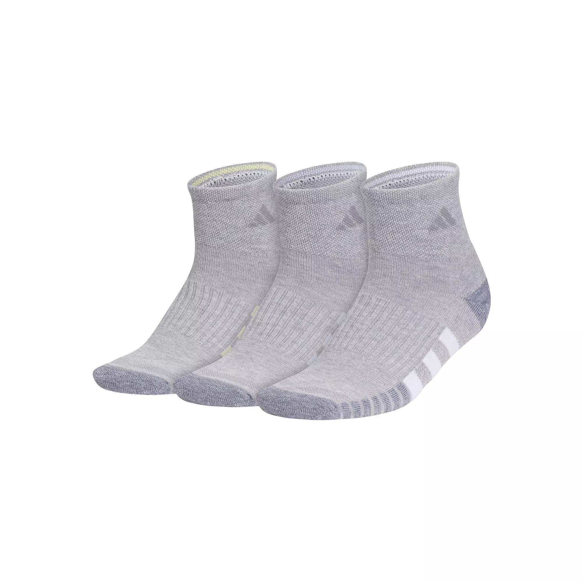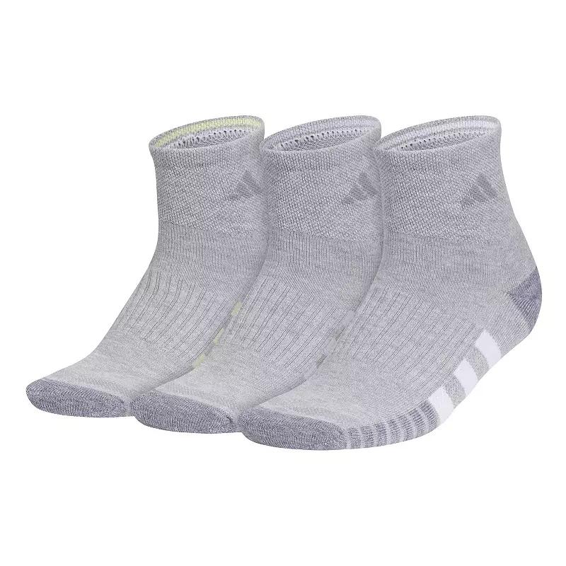 These women's adidas quarter-length socks keep feet dry and comfortable during any training session, featuring moisture-wicking yarn and mesh zones for added ventilation. How do you accessorize? Check out our ACCESSORIES GUIDE for essential tips to elevate your style with must-have accessories.PRODUCT FEATURES Includes 3 pairs of socks Quarter sock silhouette Moisture-wicking yarn keep feet dry from sweat Arch compression secures foot & offers extra support Cushioned foot for comfort & durability Targeted mesh ventilation for added breathabilityFABRIC & CARE 82% recycled polyester, 15% cotton, 3% spandex Machine wash ImportedSUSTAINABILITY FEATURES Contains recycled materials Size: 5-10. Color: Lt Hthr Yellow Violet. Gender: female. Age Group: adult.