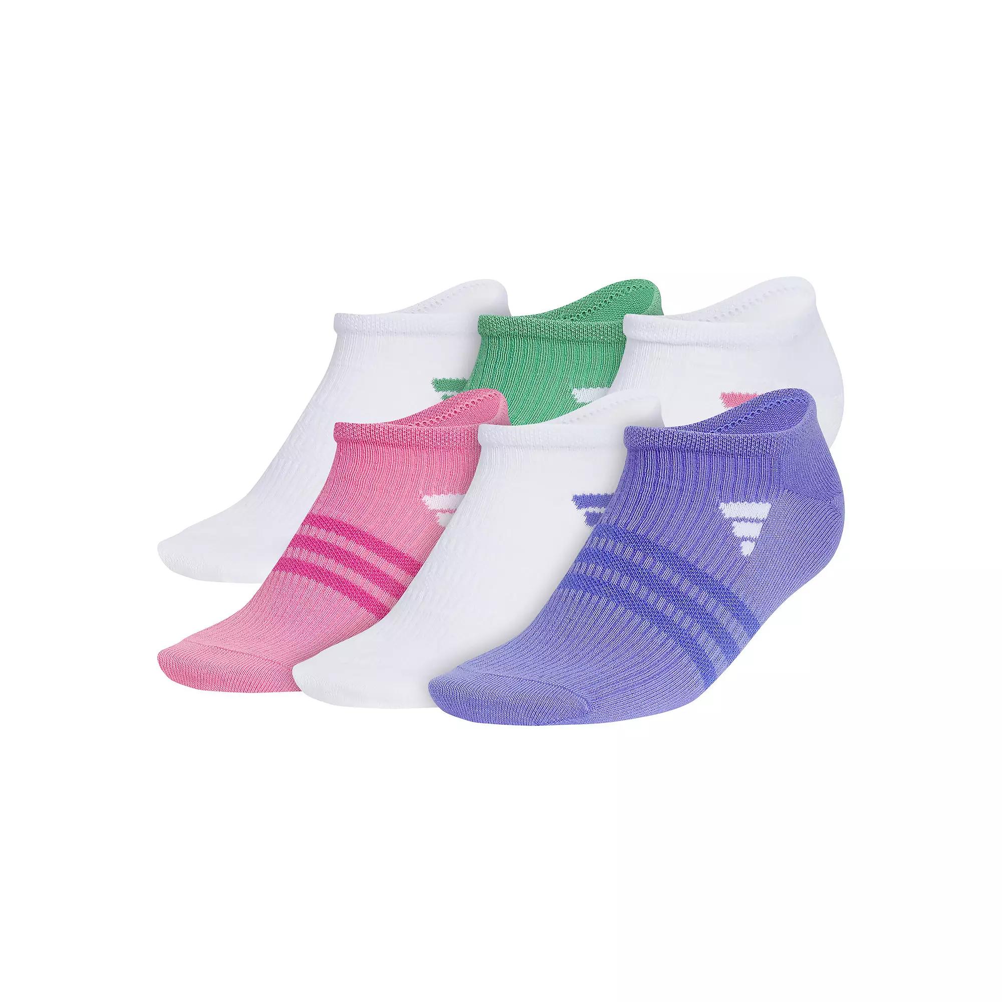 Give your sock drawer an athletic refresh with this six-pack of womens no-show socks from adidas. How do you accessorize? Check out our ACCESSORIES GUIDE for essential tips to elevate your style with must-have accessories.FEATURES Includes 6 pairs of socks Moisture-wicking construction Lightweight and durable Arch compression secures foot and offers extra supportFIT DETAILS No-show silhouette Fits shoe sizes 5-10 One size fits mostFABRIC & CARE Polyester, spandex Machine wash Imported Color: White Green Pink. Gender: female. Age Group: adult.