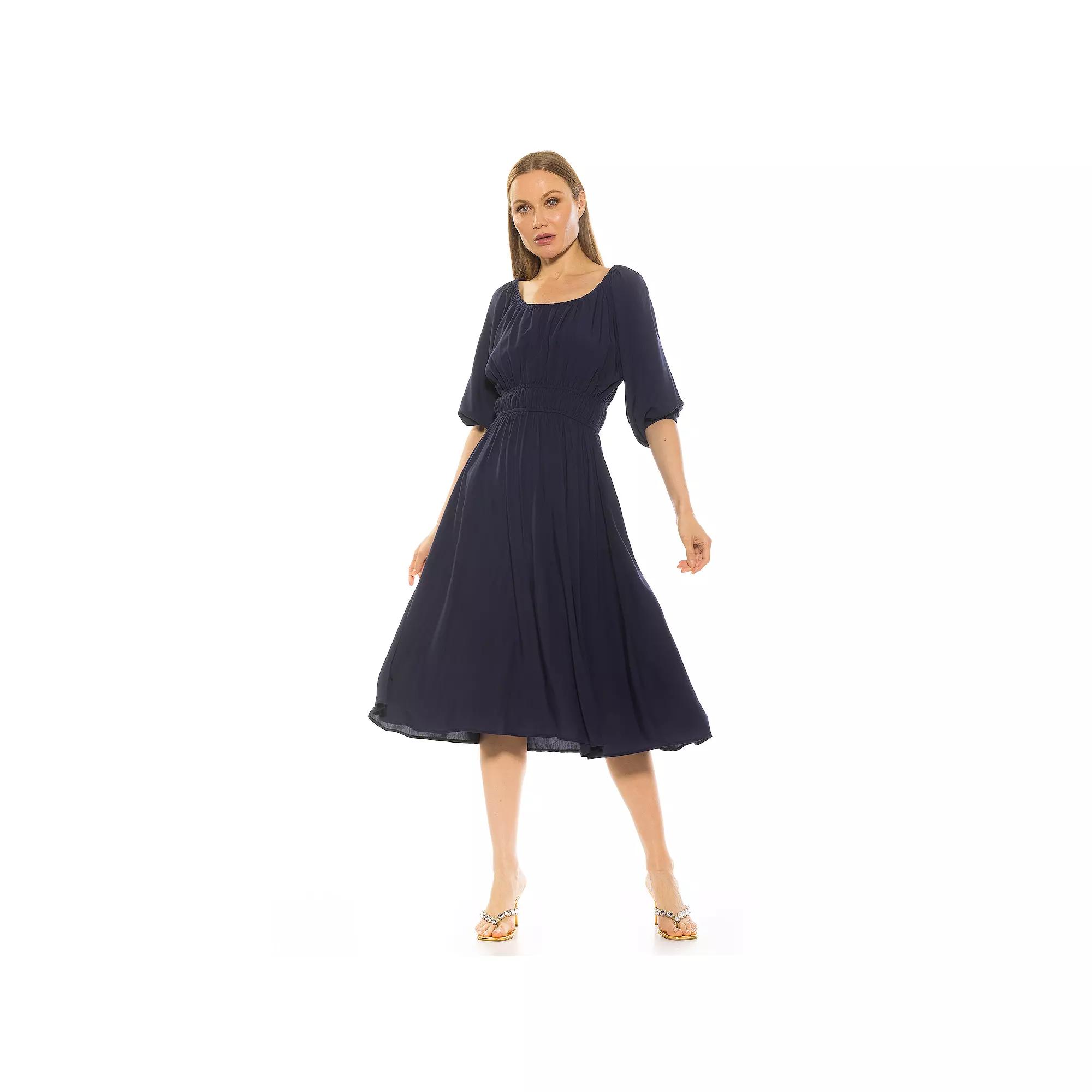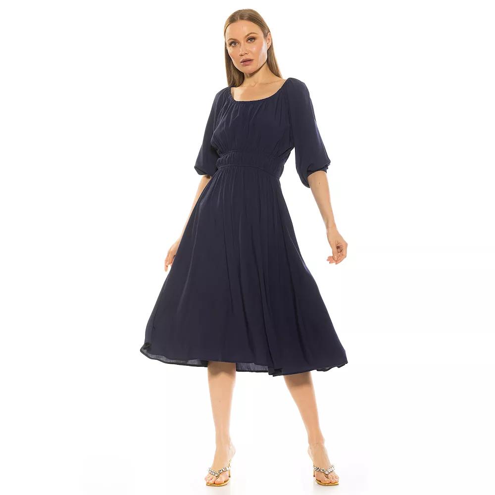 The Emily Fit & Flare Scoopneck Shirred Dress is a must-have piece for your wardrobe.Click on this WOMEN'S GUIDE to find the perfect fit and more! The Emily Fit & Flare Scoopneck Shirred Dress is a must-have piece for your wardrobe.Click on this WOMEN'S GUIDE to find the perfect fit and more! FEATURES Fit & flare silhouette Scoopneck Short bishop sleeves No closure - pullover styling UnlinedFIT & SIZING 47-in. length from shoulder to hem Midi length hits below the kneeFABRIC & CARE Rayon, tencel Machine wash and tumble dry Imported Size: Medium. Color: Navy. Gender: female. Age Group: adult.