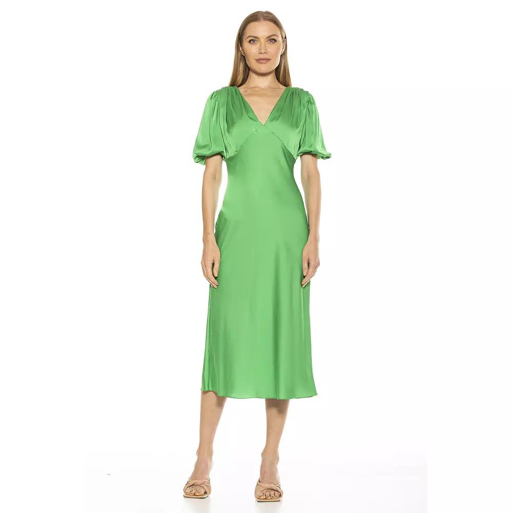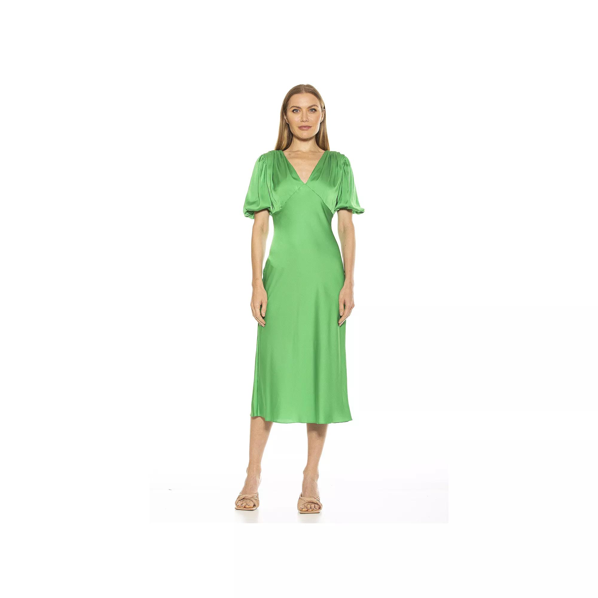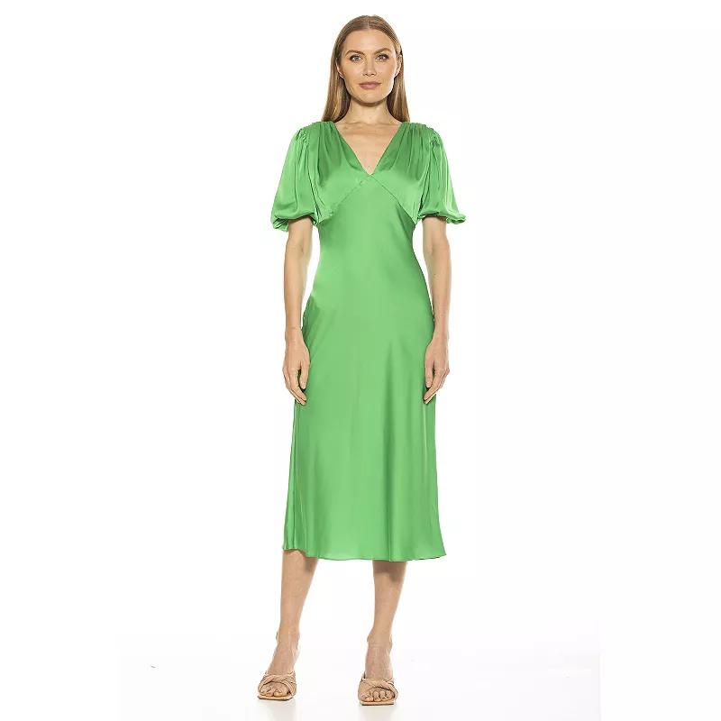This vintage inspired V-neck dress has a slight stretch and features puff sleeves with shoulder gathers along with an empire waistline leading to a flowy hem. 46 1/4 length (size 4) Short sleeves Center back hidden zip closure 97% polyester, 3% spandex Hand wash cold Imported Model stats: 510 height, 32 bust, 25 waist, 36 hip. Model is wearing size 4.