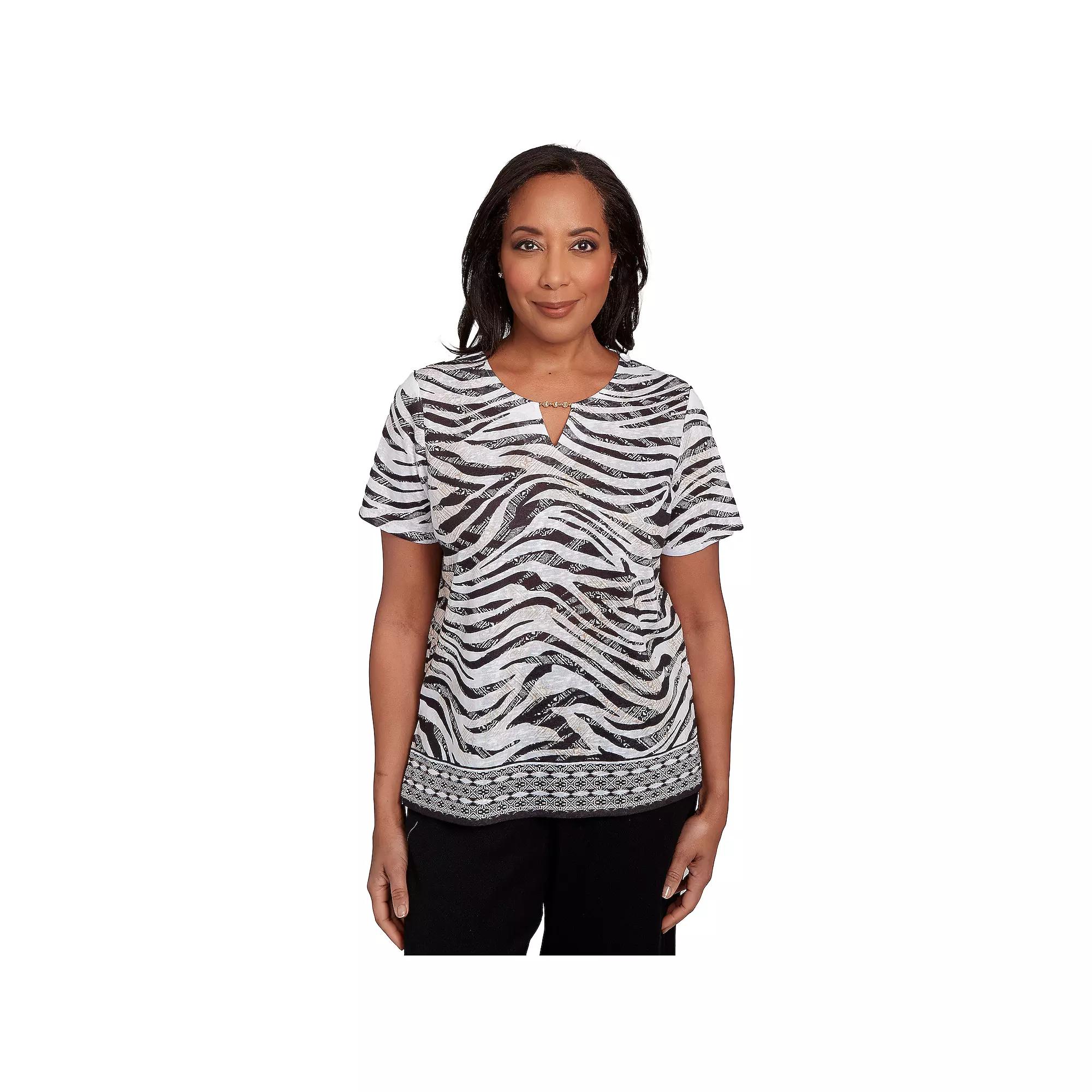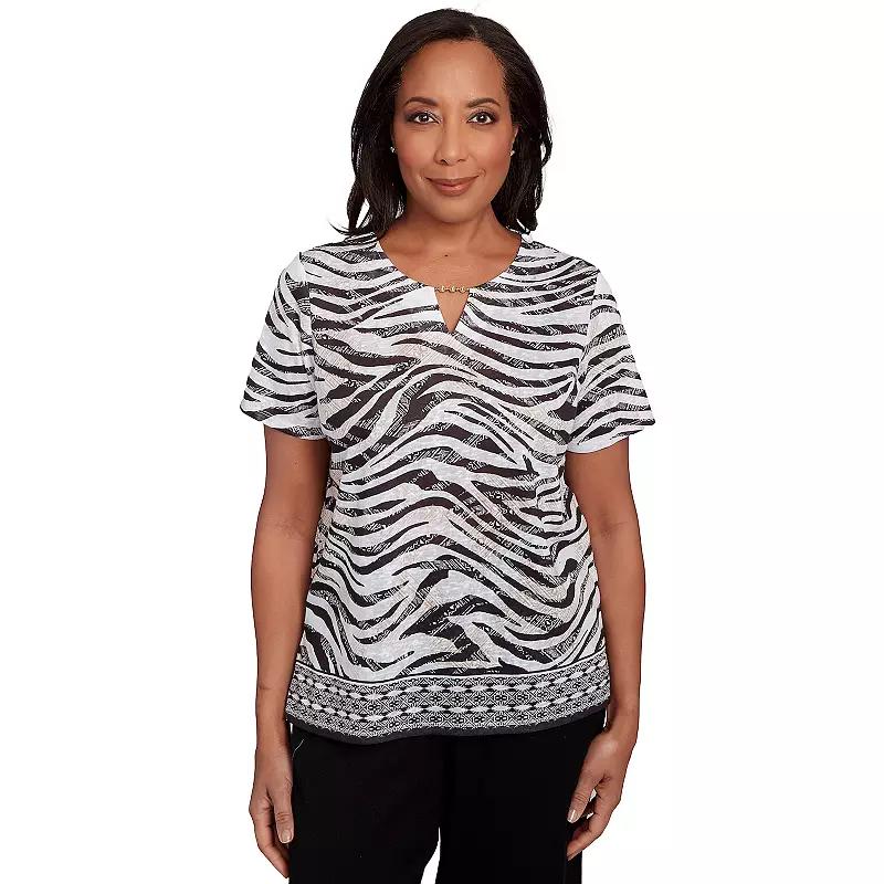 This women's animal print top from Alfred Dunner is the perfect pop of color to add to your wardrobe!Click on this WOMEN'S GUIDE to find the perfect fit and more!This women's animal print top from Alfred Dunner is the perfect pop of color to add to your wardrobe!Click on this WOMEN'S GUIDE to find the perfect fit and more!FIT & SIZING Splitneck Short sleeves 24 1/2-in. length from shoulder to hem No closure - pullover stylingFABRIC & CARE Polyester Machine wash and tumble dry ImportedRESPONSIBLE Phthalate free Size: Medium. Color: Black And. Gender: female. Age Group: adult.
