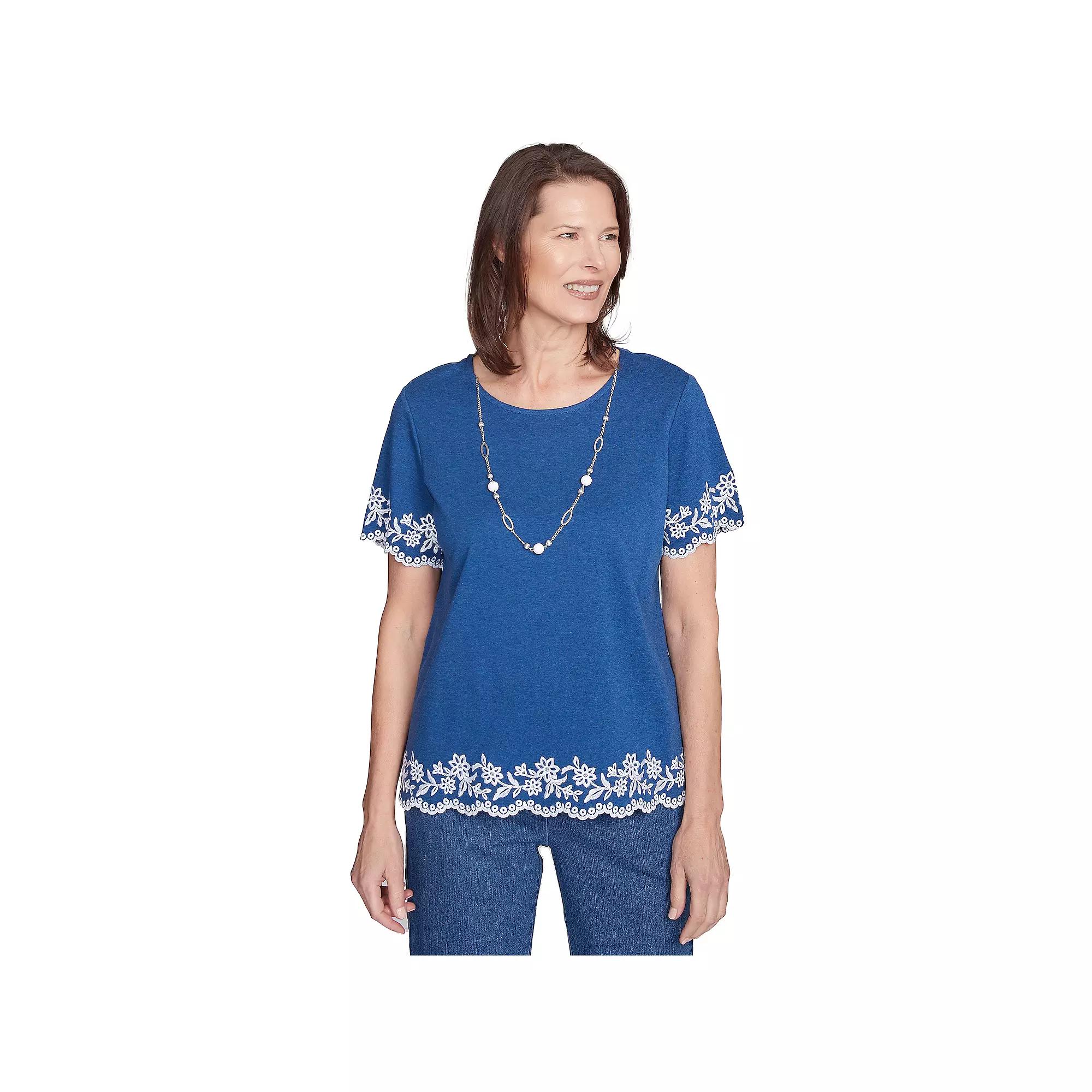 Step into style with this Women's Alfred Dunner Border Embroidery Tee with Necklace.Click on this WOMEN'S GUIDE to find the perfect fit and more!Step into style with this Women's Alfred Dunner Border Embroidery Tee with Necklace. Click on this WOMEN'S GUIDE to find the perfect fit and more!FEATURES Includes: top and necklace Short sleeves CrewneckFIT & SIZING 24 1/2-in. length from shoulder to hemFABRIC & CARE Cotton, polyester Machine wash and tumble dry Imported Size: X Large. Color: Heather Navy. Gender: female. Age Group: adult.