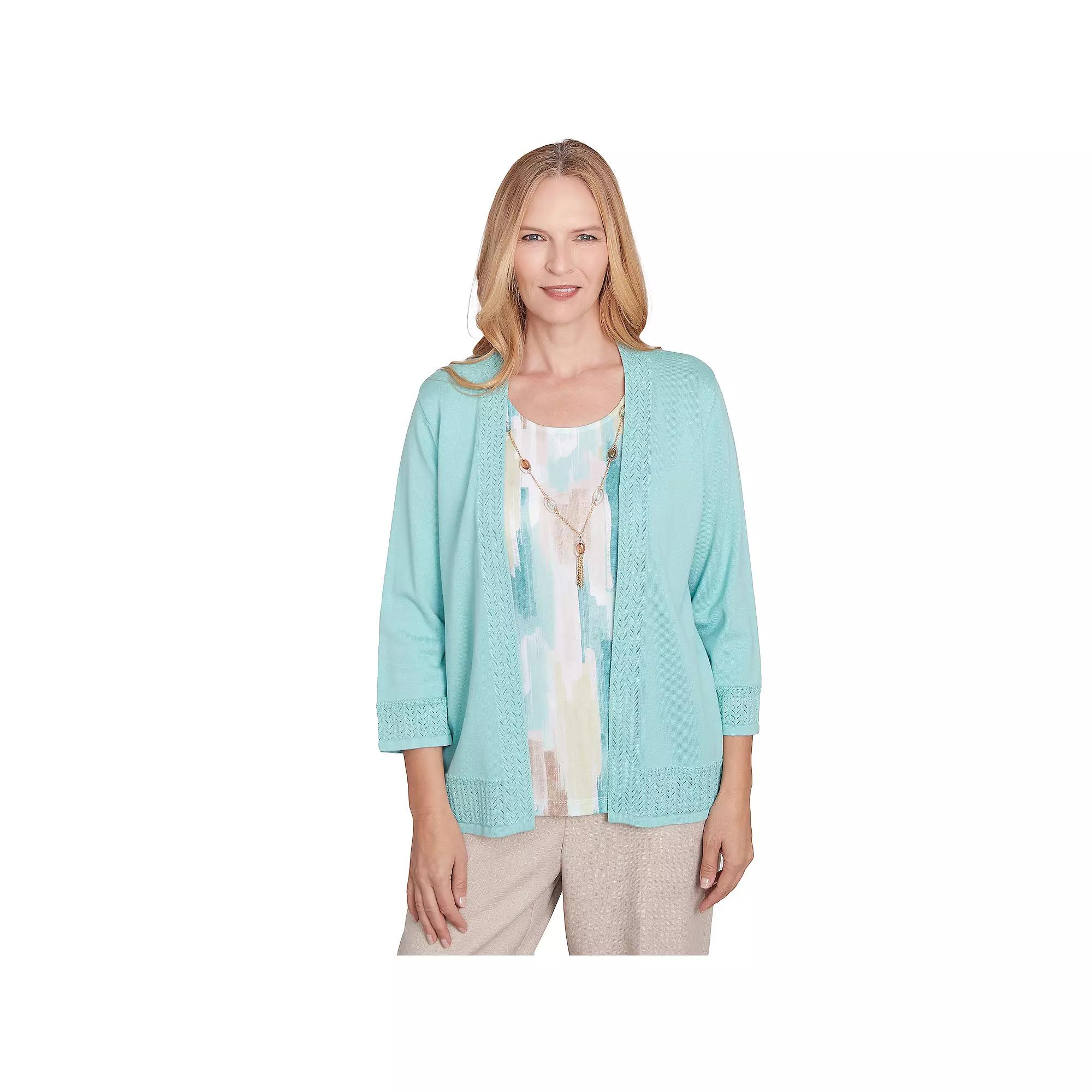 Give you wardrobe a fresh new look with this womens Alfred Dunner brushstroke inner two-in-one sweater with necklace.Click on this WOMENS GUIDE to find the perfect fit and more!Give you wardrobe a fresh new look with this womens Alfred Dunner brushstroke inner two-in-one sweater with necklace.Click on this WOMENS GUIDE to find the perfect fit and more!FEATURES No closure - pullover styling Crewneck 3/4-length sleeves Inner layer offers a comfortable and stylish base, while the outer cardigan provides warmth and versatility Detachable necklace offers versatility, allowing you to customize your lookFIT & SIZING 25 1/2-in. length from shoulder to hemFABRIC & CARE Cotton, acrylic Hand wash and line dry Imported Size: Small. Color: Pistachio. Gender: female. Age Group: adult.
