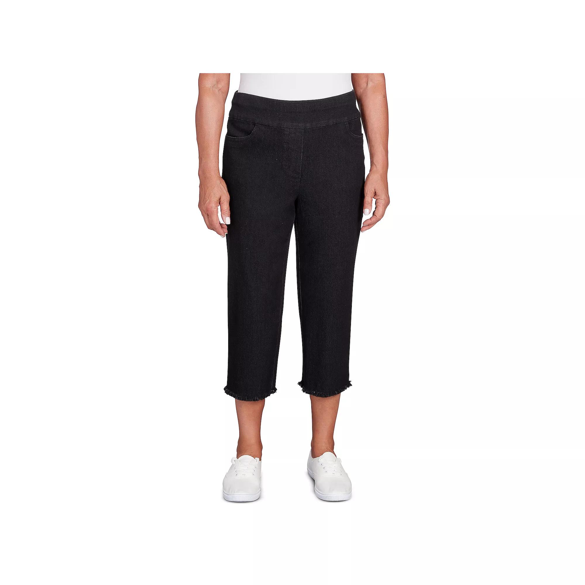 Step up your casual looks with these women's Alfred Dunner denim capri pants.Click on this WOMEN'S GUIDE to find the perfect fit and more!Step up your casual looks with these women's Alfred Dunner denim capri pants. Click on this WOMEN'S GUIDE to find the perfect fit and more!FEATURES Super stretch denim Fringe detail No closure - pull-on stylingFIT & SIZING Short: 20 3/4-in inseam Midrise sits on the high hip Elastic waistbandFABRIC & CARE Cotton, polyester, spandex Hand wash and tumble dry Imported Size: 14. Color: Black. Gender: female. Age Group: adult.