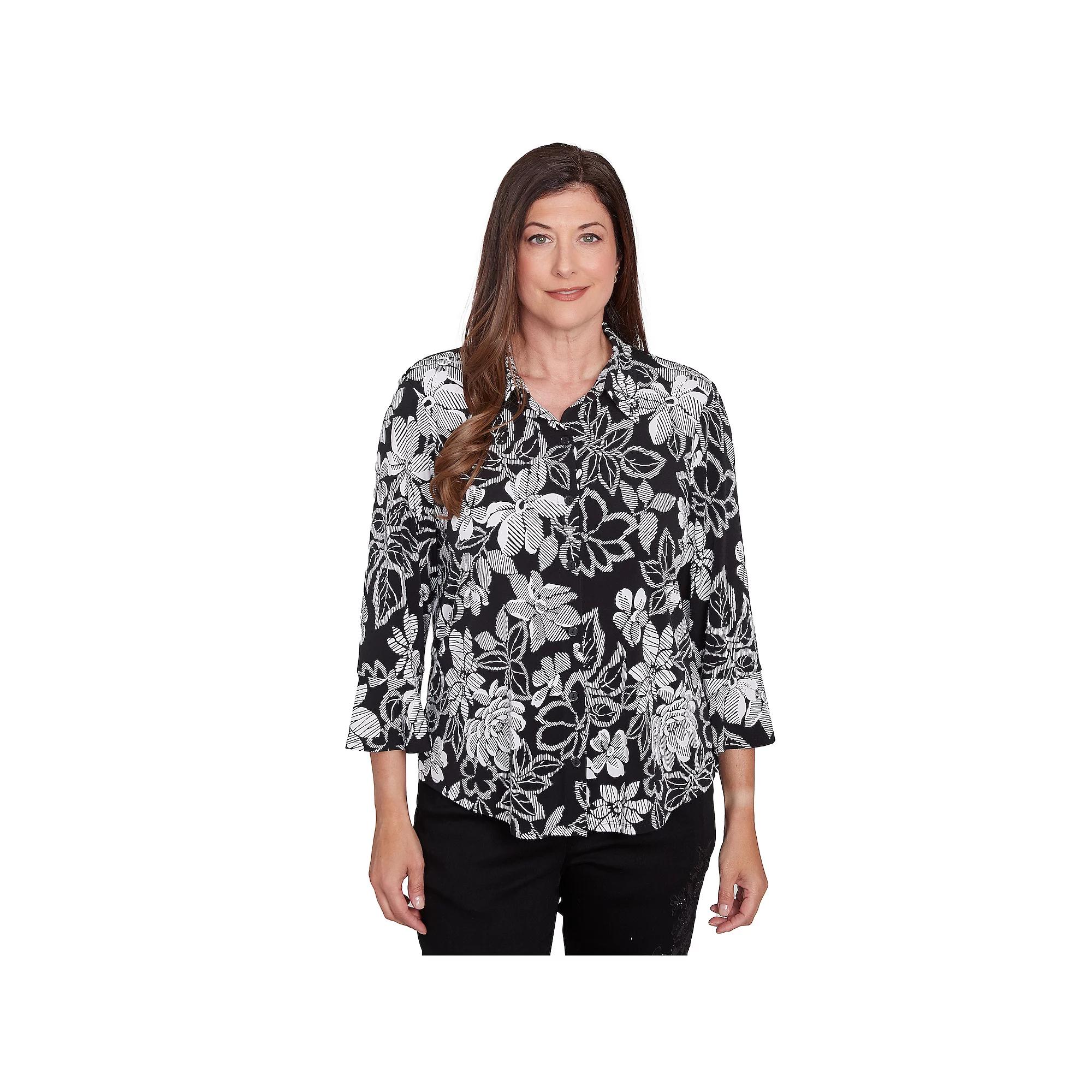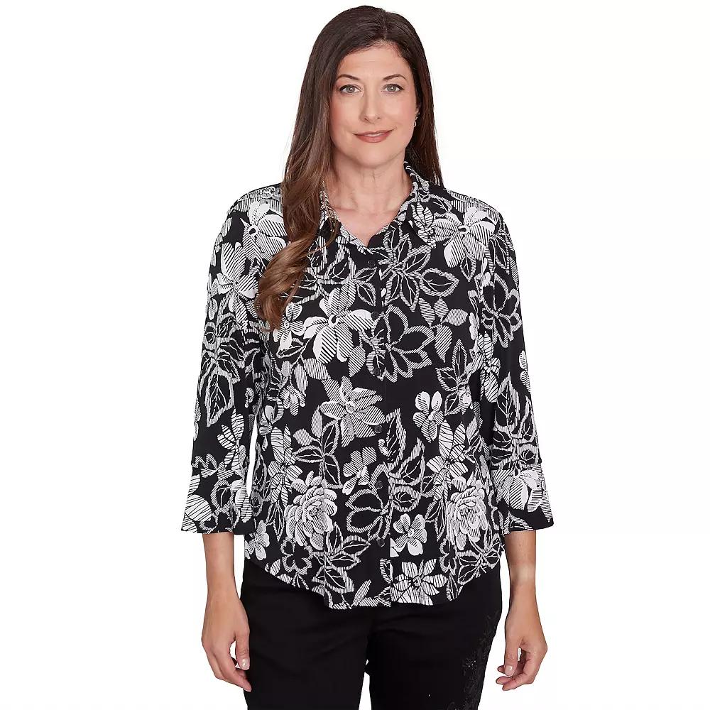 This stylish womens Alfred Dunner Floral puff print button down top combines classic elements with a modern twist. The black and white floral print adds a touch of sophistication, while the flared three-quarter sleeves and collared neckline create a flattering silhouette. Click on this WOMENS GUIDE to find the perfect fit and more!This stylish womens Alfred Dunner Floral puff print button down top combines classic elements with a modern twist. The black and white floral print adds a touch of sophistication, while the flared three-quarter sleeves and collared neckline create a flattering silhouette. Click on this WOMENS GUIDE to find the perfect fit and more!FEATURES Collared neckline 3/4-length sleeves Pullover stylingFIT & SIZING 25 1/4-in. length from shoulder to hemFABRIC & CARE Polyester, spandex Machine wash and line dry Imported Size: Large. Gender: female. Age Group: adult.