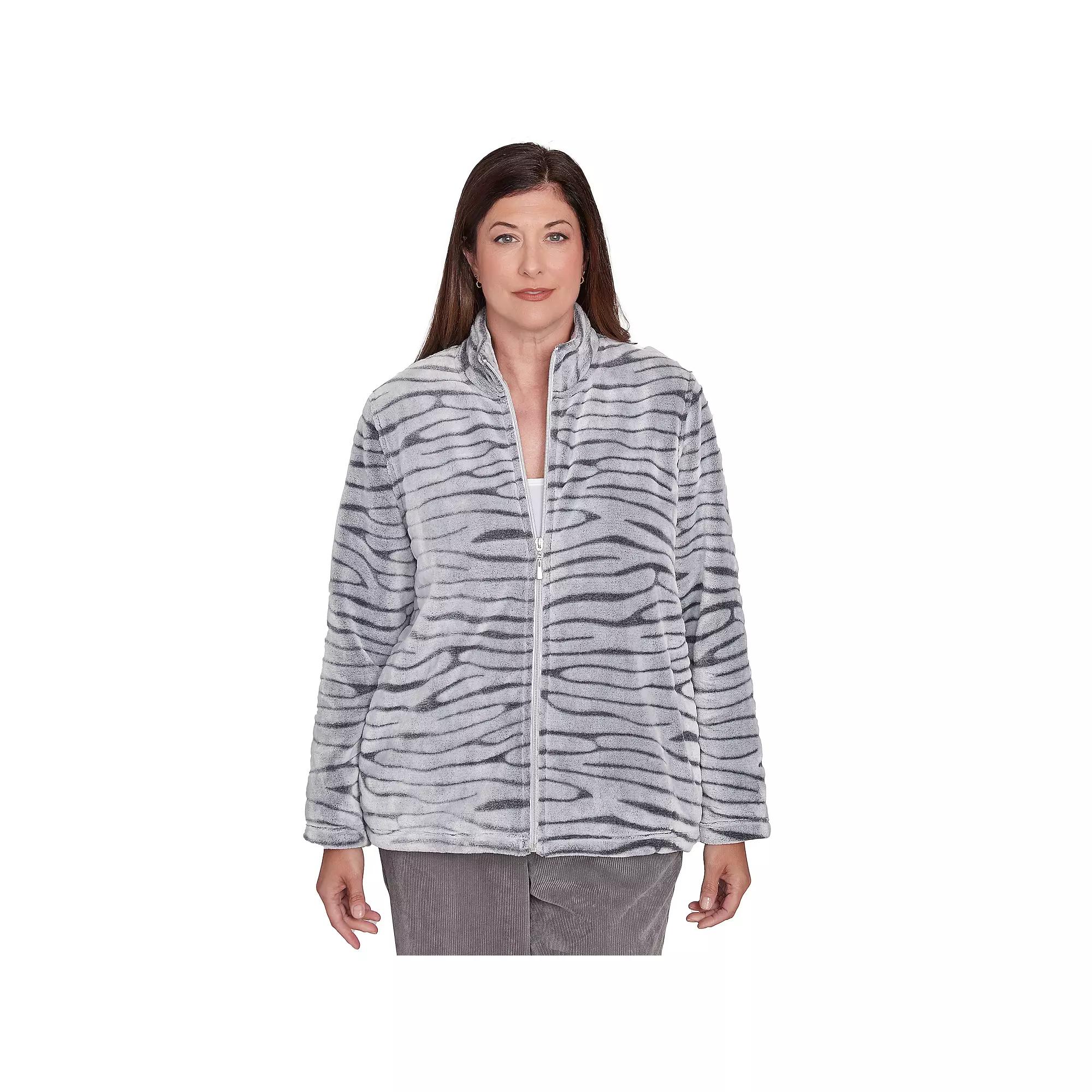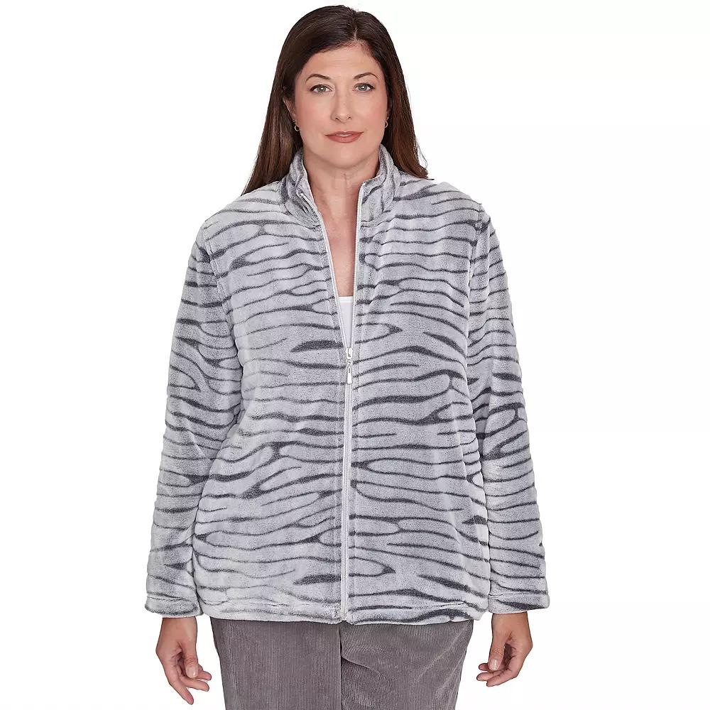 Keep your wild side alive in this womens petite cozy animal, faux fur jacket from Alfred Dunner. Rest assured you wont be too hot or too cold in this jacket.Click on this WOMENS GUIDE to find the perfect fit and more! Keep your wild side alive in this womens petite cozy animal, faux fur jacket from Alfred Dunner. Rest assured you wont be too hot or too cold in this jacket.Click on this WOMENS GUIDE to find the perfect fit and more! FEATURES Full length zipper High collar Side pockets No closure - pullover styling Long sleevesFIT & SIZING 23-in. length from shoulder to hemFABRIC & CARE Polyester Machine wash and line dry Imported Color: Graphite. Gender: female. Age Group: adult. Pattern: zebra.