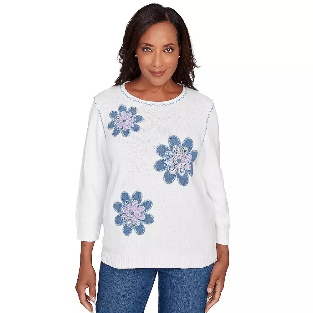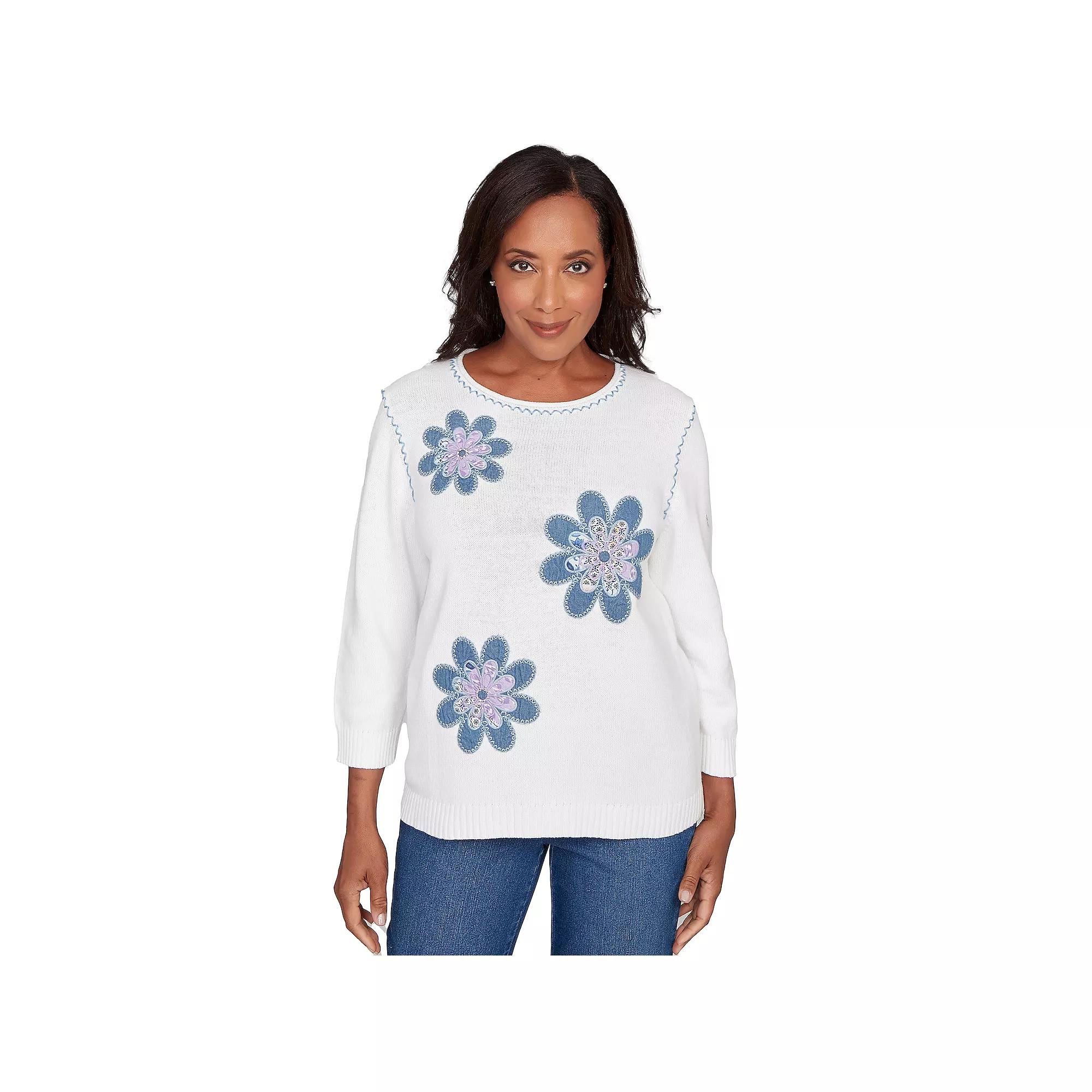Cozy up in this delightful sweater that features charming denim patchwork floral appliques for a handcrafted vibe. With its crew neckline, three-quarter sleeves, and ribbed finishes, this Alfred Dunner gem is perfect for layering and will keep you looking effortlessly chic on those cooler days. Click on this WOMEN'S GUIDE to find the perfect fit and more! - https://www.kohls.com/feature/womens-fit-guide.jsp. FEATURES: Denim patchwork floral appliques for a charming, handcrafted feel. FIT & SIZE: 24 1/2-in. length from shoulder to hem. MATERIAL & CARE: Cotton, acrylic & polyester, Hand wash. DETAILS: No closure - pullover styling, Crewneck, 3/4-in. length sleeves, No pockets, Imported. Size: X Large. Color: Ivory. Gender: female. Age Group: adult. Material: COTTON BLEND.
