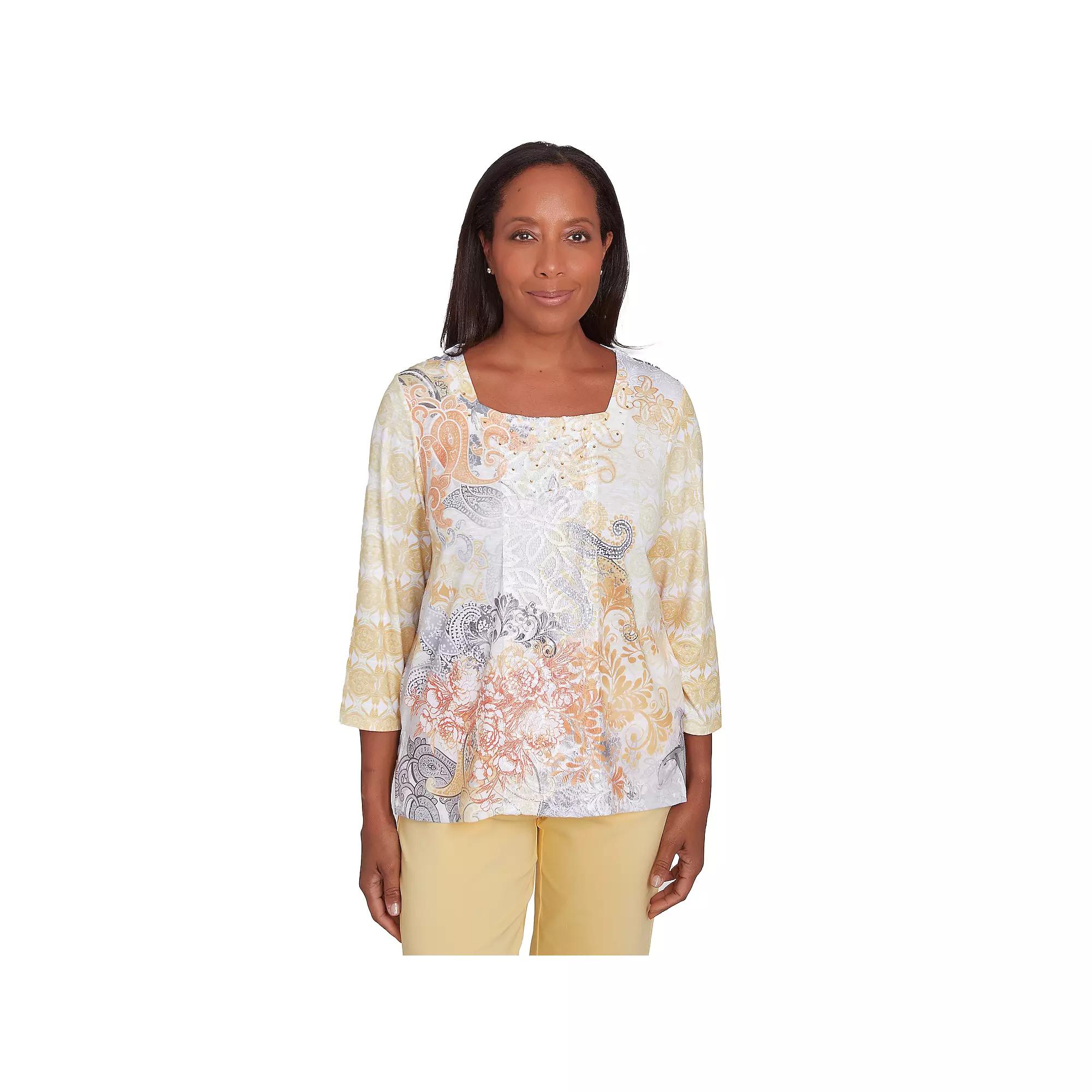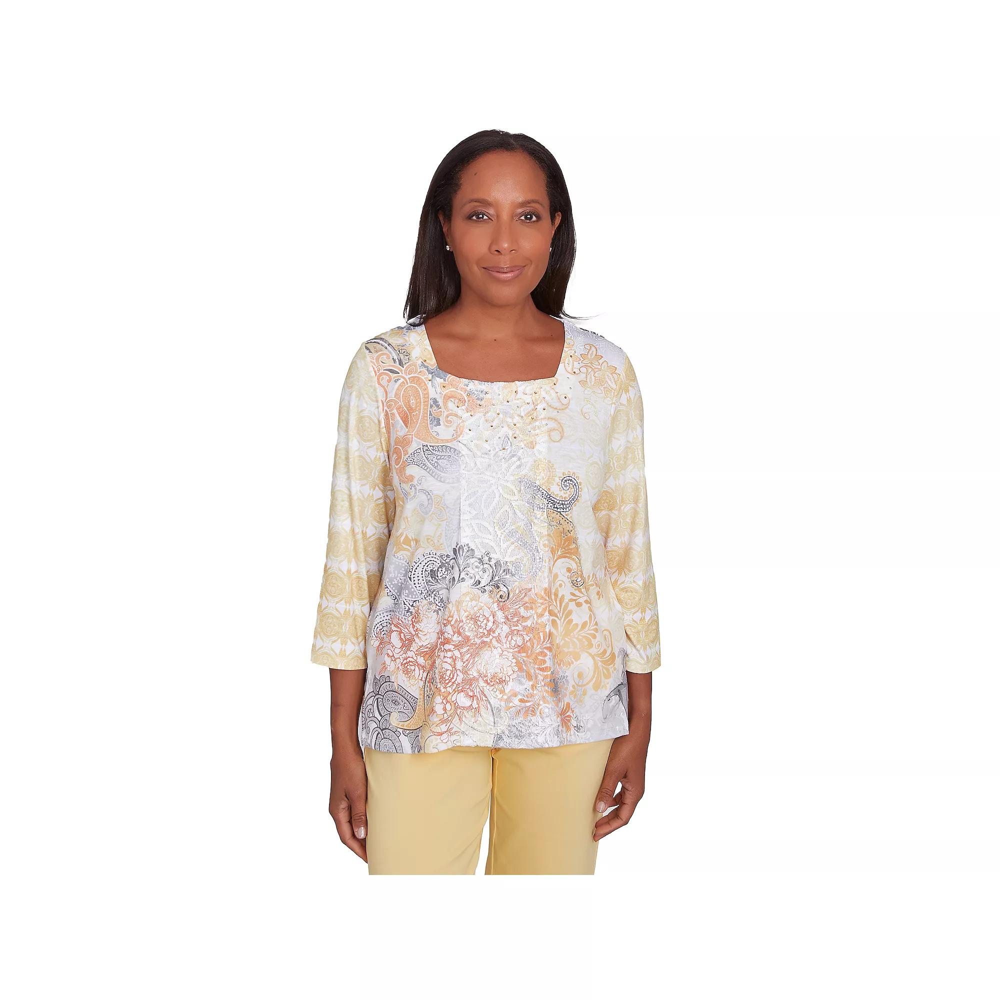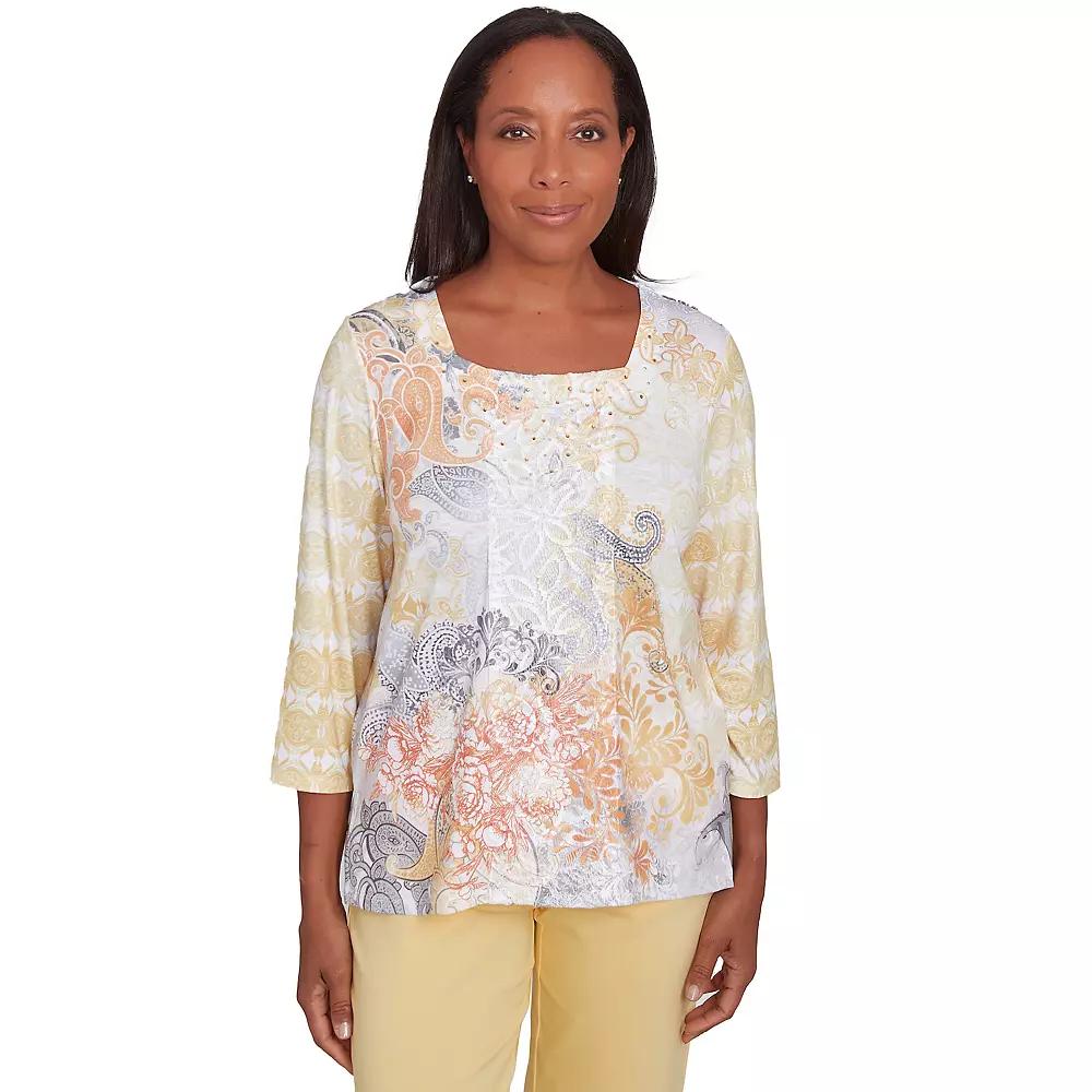 Enjoy the intricate beauty of this petite Alfred Dunner square neck paisley geometric top. Click on this WOMENS GUIDE to find the perfect fit and more!Enjoy the intricate beauty of this petite Alfred Dunner square neck paisley geometric top. Click on this WOMENS GUIDE to find the perfect fit and more!FEATURES Squareneck 3/4-length sleeves Straight hemline Pullover stylingFIT & SIZING 22-in. from shoulder to hemFABRIC & CARE Polyester, spandex Machine wash and tumble dry Imported Size: S Petite. Color: Yellow Team. Gender: female. Age Group: adult.